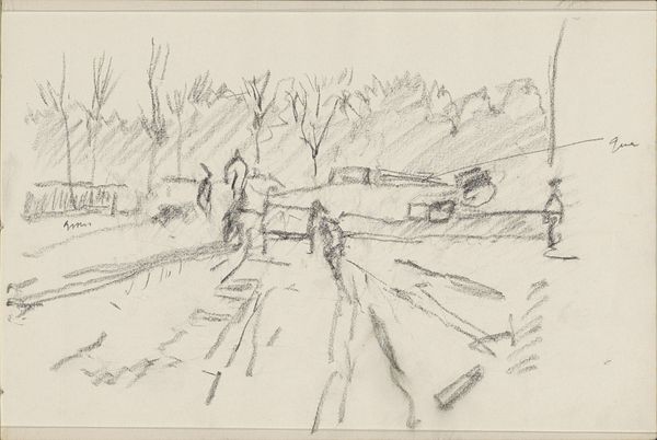 Curator: Welcome. We're looking at George Hendrik Breitner's "Bouwput aan de Van Diemenstraat te Amsterdam" from 1897, currently held in the Rijksmuseum. Editor: It’s a hasty sketch! Almost gestural. I can almost feel the speed of the artist's hand, dashing to capture this… scene. What is it exactly? Controlled chaos maybe? Curator: Precisely! Observe the application of line. There is no traditional perspectival space rendered, rather, layered linear configurations. Note how, in the upper register, several sailing ships reside near what might be, below, a flattened building site with a figure rendered prostrate in the foreground. Editor: That figure...almost engulfed by the excavation. This piece speaks to the working classes who were so fundamentally transforming the Dutch landscape at this time. I am interested in labor exploitation; consider what this era entailed for workers who would have been tasked with executing such massive projects. What were the artist's ethical obligations in representing it? Curator: While context certainly enriches our viewing experience, to only approach a work in such a manner flattens the rich intrinsic formal language. How might the high contrast sketch be seen to communicate affect in and of itself? Its composition does not point the viewer in a direct, stable direction; thus mirroring the unstable nature of constant growth, perhaps. Editor: True! It's definitely a study in contrasts--the rigid vertical masts versus the implied downward trajectory of the worker, the detailed rendering of the ships on the horizon against the bare excavation in the foreground. All highlighting how one class profits and the other is forgotten. Curator: We can't be sure that was Breitner's goal in creation, can we? What cannot be argued, I think, is the composition's engagement in non-hierarchical dissemination. Every corner of the drawing calls the eye. Editor: Indeed. Despite its fleeting nature, the artwork holds the gaze, compels reflection. Curator: Breitner’s study shows us just how much can be extracted from the humblest of mediums, like graphite on paper, through both the eye of the hand and mind. Editor: A quick reminder of labor as the cornerstone of progress, progress built and extracted. Thank you.