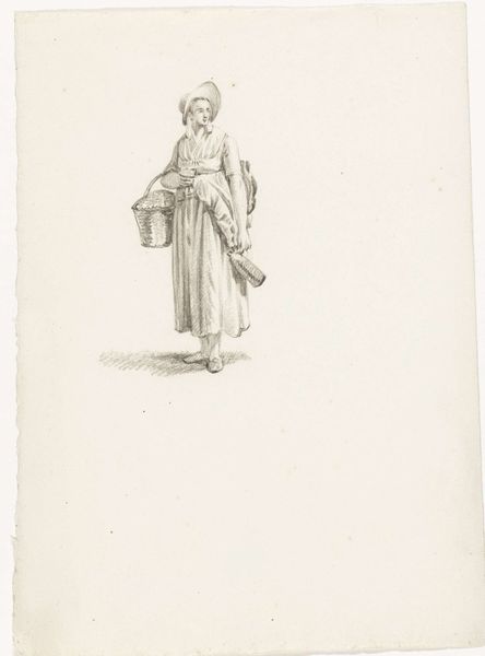 Christian Bernhard Rode created this drawing, "Allegorie van de verstandigheid," using pen and brown ink. The composition immediately draws you in with its classical simplicity. We see a female figure, likely an allegorical representation of prudence or wisdom. Rode employs a delicate balance of line and space. The figure is rendered with fine, detailed lines that define her drapery and form, while the negative space around her isolates the subject. This contrast emphasizes her presence and creates a contemplative mood. The light seems to fall softly, casting subtle shadows that give depth to the figure. Rode engages with a tradition that uses symbolic objects to deepen meaning; the serpent encircling the mirror becomes a potent signifier of self-reflection. It invites us to consider how the drawing challenges fixed meanings. This piece invites us to ongoing interpretation.