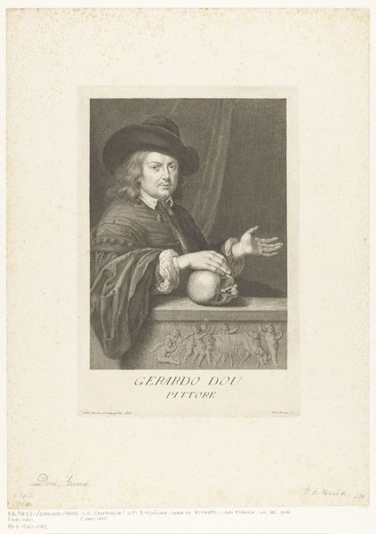 Curator: Here we have Pietro Antonio Pazzi's portrait of Gerard Dou, housed here at the Harvard Art Museums. It's a striking piece. Editor: My first thought? It's unsettlingly charismatic. Like, the guy’s holding a skull but still manages to look like he's about to crack a joke at a party. Curator: It's a classic memento mori—a reminder of mortality. The skull, combined with his gesture, might suggest Dou’s contemplation of life, death, and art. Editor: Right. And that theatrical curtain behind him? The cherubs on the ledge? It’s all very staged, very self-aware. I wonder if he felt the weight of expectation. Curator: Certainly, Dou's legacy as a master of detail would have been well-established by the time Pazzi created this portrait, adding another layer of self-consciousness. Editor: It makes me think about the pressure to create, to leave your mark. Is that skull taunting or inspiring him? Perhaps both. Curator: Precisely. Pazzi's artwork prompts us to reflect on how artists grapple with their own legacies. Editor: Yeah, it really does put things into perspective, doesn't it?