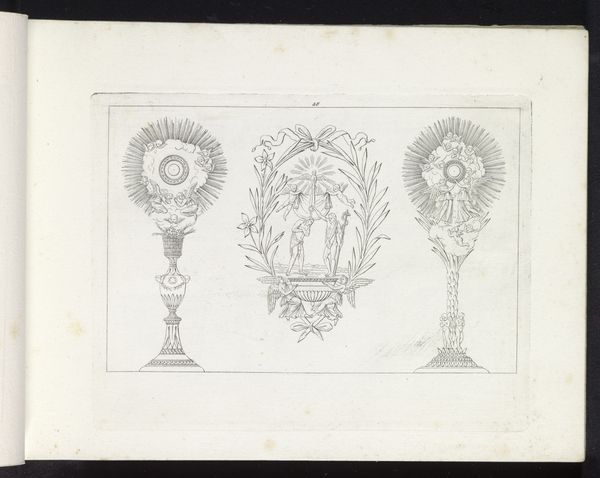 Editor: Here we have Pietro Ruga's drawing, "Two Incense Vessels and a Monstrance," created in 1817 using ink. The rendering feels so precise and almost technical, like an architectural plan. What do you see in this piece? Curator: This drawing transports me to a time steeped in ritual. The objects themselves, incense vessels and the monstrance, are laden with symbolic weight. The monstrance, especially with its radiant sunburst, recalls not just religious devotion but perhaps even ancient sun worship traditions that echo through Christianity. Don't you find the Neoclassical style lends an air of timelessness, too? Editor: It definitely does. I was also thinking about how geometric those sunbursts look. Why do you think Ruga leaned so hard into symmetry and clean lines when depicting religious objects? Curator: Perhaps Ruga was commenting on the era. The Age of Enlightenment emphasized reason, so Neoclassicism offered a visual language of order during revolutionary upheaval. This drawing then becomes more than just representation; it’s a study in how power—religious and political—wants to be perceived: stable, eternal, divinely ordained. What do you think the emphasis on line contributes to this symbolism? Editor: The linear quality almost flattens them. Rather than hyper-realistic figures, we get ideas of the objects. The cultural memory, almost, instead of the object. Curator: Precisely! They become emblems of a belief system. It speaks to the enduring power of symbols. I think I’ll revisit our exhibit labels through that lens.