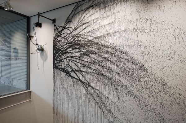 Editor: This is Richard Long's *Waterfall Line*, a site-specific mural at the Tate. The stark contrast really strikes me. What do you see when you look at the work? Curator: The composition is bisected into two distinct registers. Observe the upper field of swirling grey marks, a stark contrast to the dense vertical lines cascading below. Editor: So, the two visual registers are the key? Curator: Precisely. Note how Long uses this division to explore the relationship between surface and depth, the tangible and the ephemeral. The line itself is the subject. Editor: That's fascinating – I hadn't considered the interplay between those two visual planes before. Curator: Indeed, Long prompts us to focus on the raw, intrinsic elements of mark-making itself. The materiality of the line is his language. Editor: I’ll definitely think about that the next time I encounter his art!