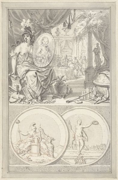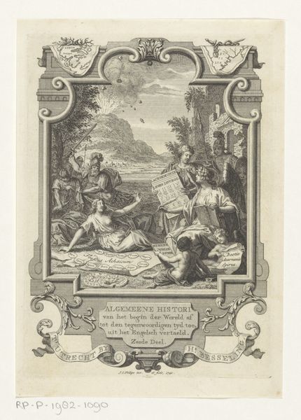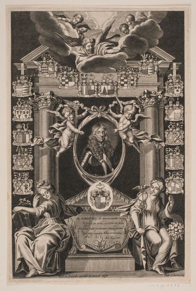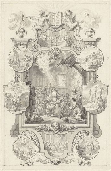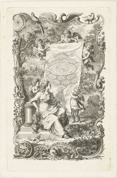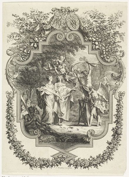 This is an allegorical print made by Jan Punt in 1749, commemorating the wedding of William Sterling and Johanna Maria Van Rijckevorsel. Its monochromatic palette emphasizes form and composition as the primary vehicles of meaning. The print is structured around a central scene framed by ornate, swirling patterns. These decorative elements serve not merely as embellishment but as a semiotic boundary, setting the stage for the marital narrative. Within this frame, Punt employs classical figures and architectural motifs to construct an idealized vision of marriage. Angels hover with garlands, while classical figures gesture in harmonious accord, creating a sense of balance. This idealized representation of marriage operates within a larger cultural discourse of the time, reflecting societal values and expectations. Yet, by presenting marriage through the lens of allegory, Punt destabilizes its fixed meaning, transforming it into a symbolic construct open to interpretation. The artwork's true strength lies in its ability to blend form and allegory, inviting viewers to decode the underlying structures of marriage through careful observation and thoughtful reflection.