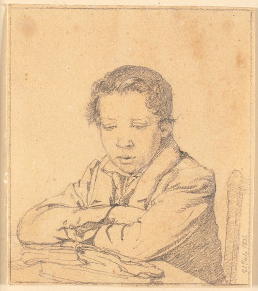 Editor: We’re looking at "Print from Drawing Book" by Luca Ciamberlano, made around 1610 to 1620. It’s an engraving on paper, showing a portrait. There's something so delicate about the lines; it makes the boy seem very pensive. What strikes you about the work? Curator: Formally, it's a compelling study in light and shadow achieved through engraving. Observe the hatching technique: Ciamberlano uses densely packed, parallel lines to define darker areas and create a sense of volume, particularly in the hair and around the collar. Note the precision in the rendering of the boy’s profile. What effect do you think the stark contrast contributes? Editor: It almost isolates the figure. The dark shading really emphasizes the softness of his face and makes his downturned gaze even more prominent. Curator: Precisely. And what about the composition? The cropped framing focuses our attention entirely on the subject, eliminating any distracting background elements. This directness emphasizes the purely formal exercise of portraying light and form. How would you describe the balance achieved? Editor: The balance feels a little asymmetrical because he is placed to the right. But the emptiness to the left keeps my attention on the detailed area to the right of the frame. Curator: An astute observation. That asymmetry is important for a dynamic composition. The engraver's emphasis is, formally, on the interplay between surface and depth, light and dark, not the illustration of story. Ultimately, the print is defined through line, tone and their distribution. What does this focus tell us about the intention of the work? Editor: It reveals a focus on the mastery of technique above all else. I see that much more clearly now. Curator: Indeed. It's about seeing how effectively an image can be made using a few essential, fundamental marks, using basic structural elements of line and tone to the upmost ability. It shows us there’s more than initially meets the eye.