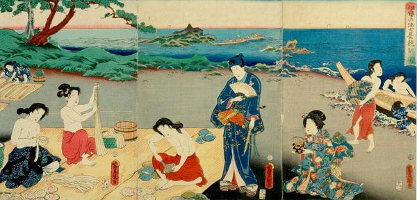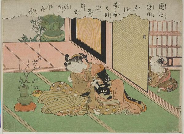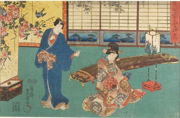 Curator: This is Utagawa Kunisada's "No. 24, from the series Magic Lantern Slides of That Romantic Purple Figure." It's a woodblock print, and part of a larger series, though we don't know the exact date of its creation. Editor: It has such a strangely serene, almost chilly atmosphere, despite the intimate domestic setting. The patterns and textures are captivating, a real feast for the eyes. Curator: Absolutely. The print offers a glimpse into Edo period gender roles, perhaps portraying courtesans in a moment of private interaction, challenging social norms even within their own confined world. Editor: I’m curious about the labor involved in creating the various textiles. Each layer of pattern speaks to specific techniques and the social position of the wearer. Curator: Indeed, thinking about the consumption of these prints also prompts reflection on class. Who could afford them, and what did they represent in terms of cultural capital? Editor: I appreciate your bringing that forward. It adds layers to the image. I find the contrast of the flat color planes and the meticulous details in the kimonos compelling. Curator: Seeing it with a fresh perspective helps me appreciate how it invites us to question the historical context and to wonder about the intimate lives of its subjects. Editor: Right. Considering the materials, the production process, and the social context really deepens my understanding of this captivating scene.