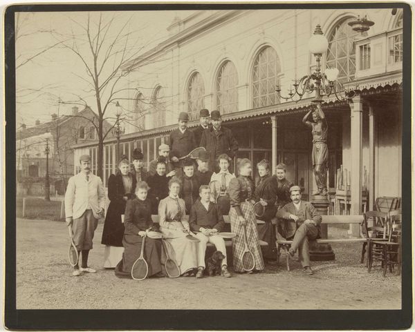 Editor: This photograph, a gelatin silver print from 1928, captures the staff of the 'Gelria' umbrella factory with the director, Arthur Schnitzler, and his wife. The subjects have such grave expressions! What can we unpack from this group portrait, aside from the somber atmosphere? Curator: Let's start with the umbrellas themselves—or rather, the *absence* of them. A photograph of an umbrella factory’s staff that omits their product raises questions. How does the act of photographing them—the material conditions and the photographic process itself—become a stand-in for their labor? This image captures not the thing they make, but them as a unit of labor. Editor: So the photo becomes about the workers themselves rather than what they produce. How would that affect its meaning? Curator: It highlights their collective role in production and how photography functions within the social and economic context. These gelatin silver prints, relatively inexpensive and reproducible at the time, allowed for mass image creation. Note also the presence of the building itself. Doesn't its architectural presence dwarf the individuals? It certainly makes the raw building materials, especially brick, stand out as symbols of industrial permanence, maybe even capitalist stability, dwarfing the workers. Editor: I never thought of it that way! So, it is less about umbrellas and more about how images and industry shape lives. Curator: Precisely. This isn’t just a simple record; it is a document intertwined with the means of production and representation. The employees aren't showing their wares, but proving, in a photograph—the thing that's being consumed—that they're at their place of work. Editor: I guess seeing it as a representation of work rather than an umbrella ad changes everything! Thank you for sharing your perspective on the subject! Curator: Absolutely. Consider how labor and material culture converge in even the most seemingly straightforward images.