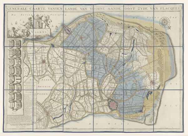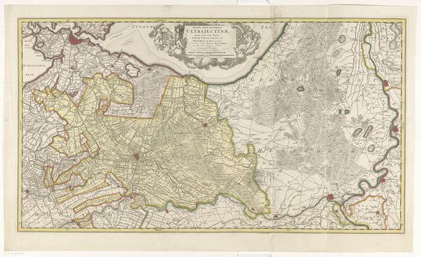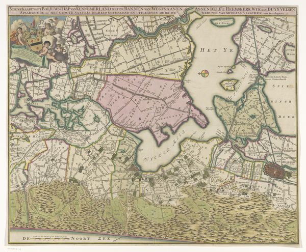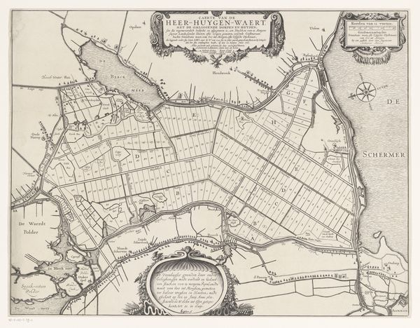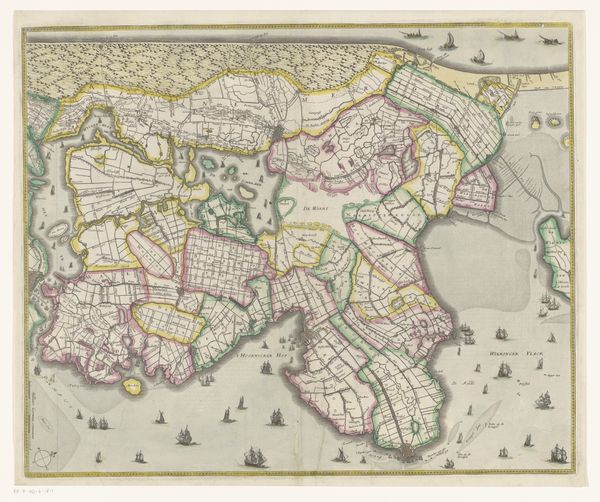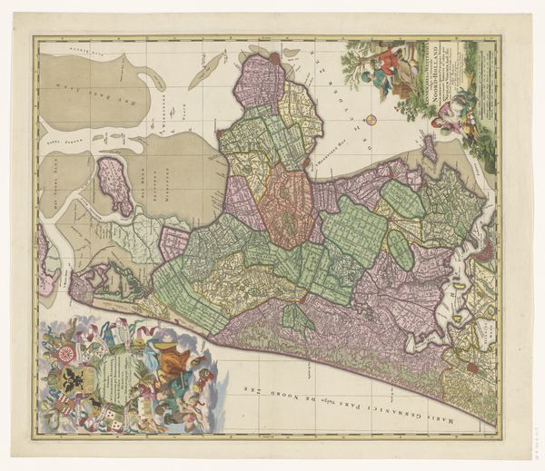 This is Hendrik Post’s hand-colored engraving of the Gooi region, notable for its complex network of lines and varied textures. The map, rendered with meticulous detail, balances geometric precision with organic forms, creating a visually engaging composition. The structural layout reveals a tension between the represented space and its abstraction. The use of fine lines to depict roads and boundaries contrasts with the more textured areas representing wooded regions. This juxtaposition highlights the relationship between human-made structures and the natural landscape. Moreover, the map challenges traditional notions of representation by transforming geographic space into a structured, semiotic system. The interplay of lines, textures, and colors does more than just represent; it interprets and organizes the world, creating a framework for understanding space and place. This cartographic approach functions not merely as a tool for navigation but as a cultural artifact that encapsulates specific ways of perceiving and interacting with the environment.