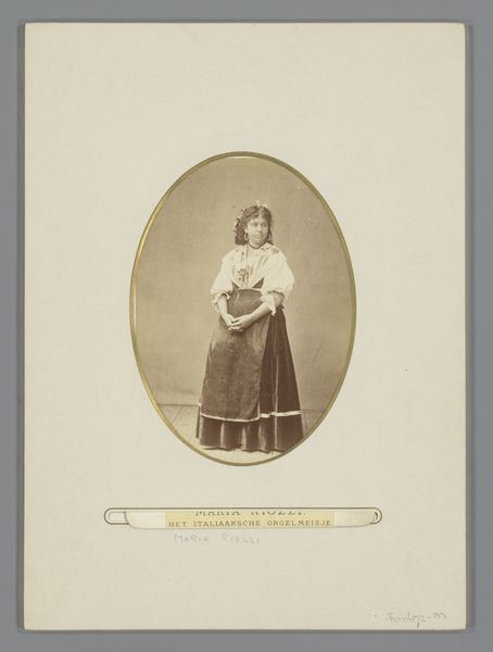 Curator: Here we have "Portret van een staande vrouw in toneelkostuum in bosdecor," a photographic portrait created by A. Eichenwald sometime before 1889. Editor: The sepia tones give it a distinctly nostalgic feel, and the theatrical backdrop certainly contributes to a sense of artifice. Curator: Indeed. Examining this photograph within its social context, we must consider the burgeoning theatrical scene and the accessibility of photography as a medium. Eichenwald capitalizes on both, producing not just a portrait, but a document of theatrical culture. Editor: Precisely. And from a formal perspective, observe how the artist arranges the elements to guide the viewer’s eye: the diagonal of the rocks mirroring the tilt of the woman’s posture, her placement almost dead-center, all constructing a very balanced, albeit staged, composition. Curator: That balance speaks, perhaps, to the cultural emphasis on composure and decorum. The production of these photographic portraits democratized representation, shifting portraiture away from exclusively painted images commissioned by the wealthy elite, opening up forms of social visibility. Editor: An important observation! Considering it’s a posed portrait against a backdrop, the tonal range provides some depth to the stage set. What's interesting, and I wonder about its success, is the attempt at naturalism by incorporating foliage on the set. Curator: We might consider how the photographic print would be distributed; what sort of labor would go into producing it? Whose consumption patterns supported Eichenwald's artistic enterprise? The answer lies partly in understanding the economics of early portrait photography studios and the value assigned to this new mode of capturing identity. Editor: From my viewpoint, it encapsulates an era when art was on the cusp of modernity. It's sentimental, romantic, even—but one sees glimmers of theatrical expression within a controlled frame. Curator: Absolutely. It invites reflection on the performative aspects of identity in that era. Editor: Yes, a study in posing! Curator: I see it as a fascinating artifact illuminating the socio-cultural conditions surrounding both photography and theater. Editor: I'm content to see how carefully considered its formal elements are and how much that gives the piece its expressive depth.