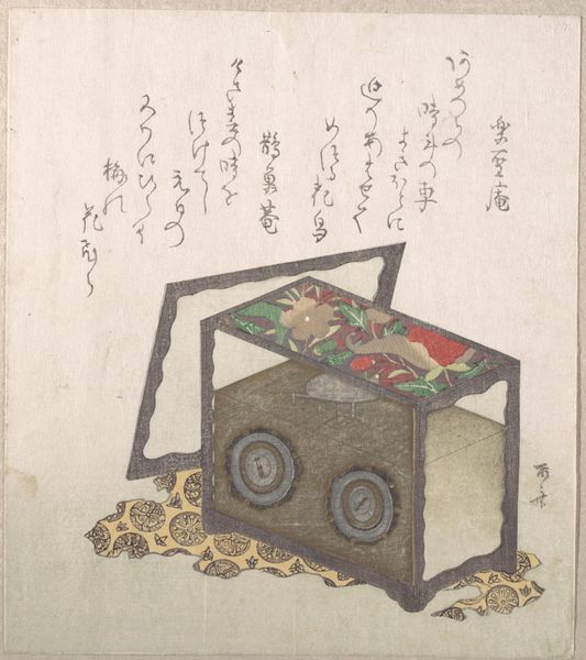 This woodblock print, made by Kubo Shunman, presents a seemingly simple box adorned with patterns and a sugoroku game, revealing intricate layers of meaning through its composition and form. The box, rendered in muted browns, establishes a central geometric form, its flat planes and sharp edges softened by the delicate cloud and character patterns. These motifs, combined with the meticulously drawn bow and drum, engage in a semiotic play, inviting viewers to decode their cultural significance and understand the box not just as a container, but as a vessel of traditional values and social practices. The artist's meticulous attention to detail and the print’s structural clarity serve not merely as aesthetic choices but function within a larger discourse about the relationship between material culture, identity, and representation. The arrangement of elements challenges fixed perspectives, creating an ongoing dialogue between form and cultural meaning, which allows for a continuous process of interpretation and appreciation.