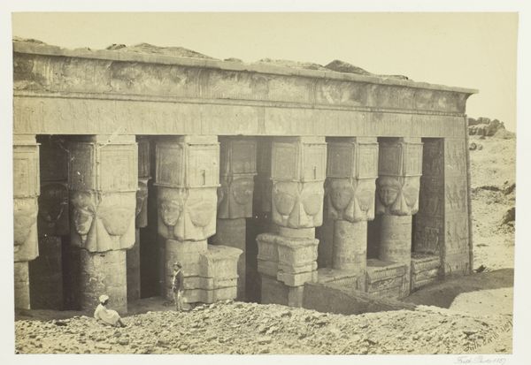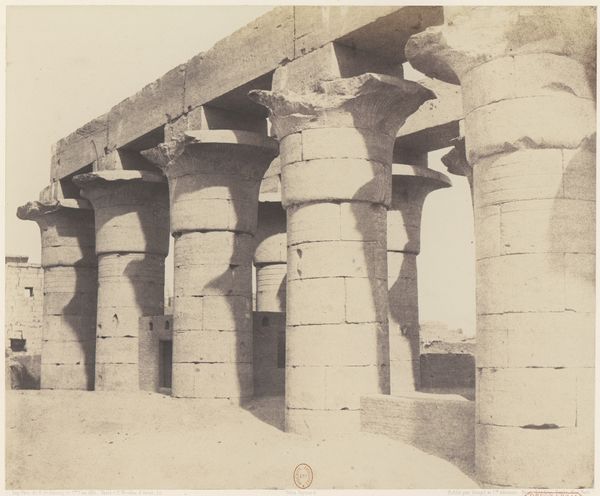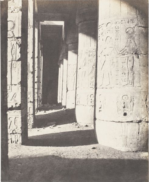 John Beasley Greene made this photograph of the Mortuary Temple of Ramses III at Medinet Habu using the collodion process, which was state-of-the-art for its time. It involved coating a glass plate with a light-sensitive emulsion. Consider the labor involved, from quarrying the stone blocks of the temple itself, to carving the hieroglyphs and figures that cover every surface. The photograph captures this intensive human effort, but it also points to the labor required for its own making. Greene would have needed to transport his bulky equipment to the site, prepare the collodion solution in a portable darkroom, expose the plate, and then develop it immediately. The final print, made using silver salts, transforms the rough stone into a range of velvety greys. We can appreciate Greene’s skill in capturing the monument’s scale and detail, but also recognize how his work is part of a longer story of human ingenuity and toil. It bridges ancient craftsmanship with the emergence of industrial image-making.