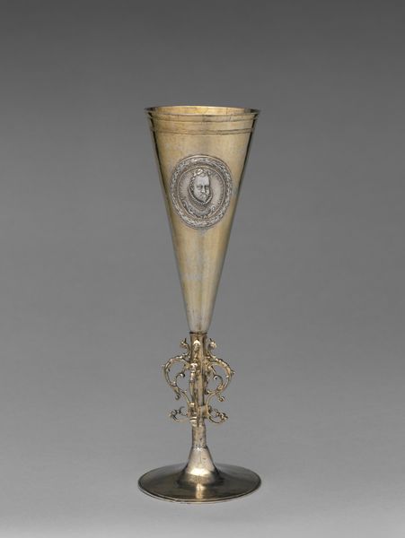 Curator: Let's examine this fascinating "Footed Beaker" made from silver. The piece is attributed to Paulus Brölfft and dates back to the latter half of the 16th century. What catches your eye first? Editor: The restrained elegance. It's a rather unassuming form elevated by delicate engraving. A quiet opulence, wouldn’t you say? It seems so pristine. What purpose might such a beaker have served in its time? Curator: Precisely. Objects like this, crafted in precious metals, frequently performed more than just a utilitarian function. They showcased status and were part of complex systems of gift-giving and display which reified social hierarchies of the era. Silver, even in this relatively simple form, advertised wealth. Editor: I'm drawn to the recurring decorative motifs. They remind me of stylized fleurs-de-lis, although somewhat abstracted. Were these strictly decorative or did they carry symbolic weight at the time? Curator: Good eye. While appearing ornamental, those patterns almost certainly signaled something to a 16th-century audience. The repeating patterns reinforced existing power structures and sometimes carried religious or dynastic implications. Remember, the visual language of the time was deeply intertwined with societal norms. Editor: I can appreciate the function within social hierarchies but, when viewed today, what I like most is the beaker’s dedication to form. I love that Brölfft highlights beauty, which might carry a different importance today, but is a concept understood universally. Curator: That's a fitting point. Objects of high craft—whether functionally practical or strictly ornamental—provided their patrons access to specific social milieus. Editor: Well, I am left marveling at how an object initially conceived to communicate one message has managed to carry a new one across centuries. Curator: Absolutely. Its survival allows us to consider how aesthetics intersected with social codes and craft practices hundreds of years ago. A complex and rewarding study indeed!