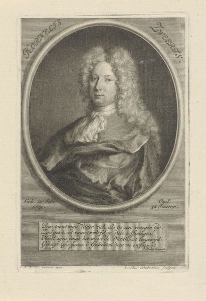 This is Johann Georg Mentzel’s portrait of Johann von Besser. A symmetrical composition framed by decorative borders in which the meticulous hatching and fine lines define the subject's status through material detail and ornamental excess. The texture and form of the subject’s wig, cascade around Besser’s face which draw attention to his expression. The formal attire, and the medal, all signify the codes of representation within aristocratic circles and display the subject’s elevated social position. The engraving technique allows for a play of light and shadow, that adds depth to the otherwise flat surface. As a study in representation, this print highlights the function of portraiture in constructing and reinforcing social identities in early modern Europe. The rigid formality and attention to detail underscores the significance of rank and honour.
