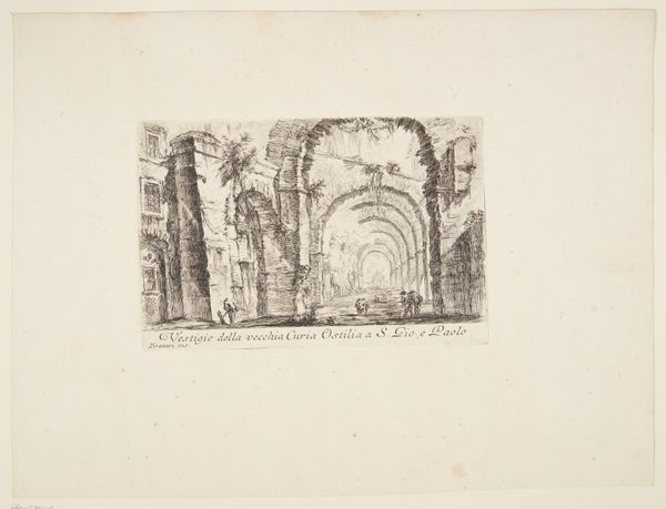 Editor: This is Giovanni Battista Piranesi's etching, "Temple of Minerva Medica near Porta Maggiore," created sometime between 1741 and 1748. It's incredibly detailed, almost romantic in its depiction of the ruins. What stands out to you? Curator: Look closely at the labor implied in both the depicted ruins and the printmaking process itself. Piranesi’s etching, though seemingly documenting history, actively participates in shaping our understanding of Roman grandeur, or its decline. Editor: In what way does it shape our understanding? Curator: Think about the consumption of such prints. They weren't merely artistic creations but commodities, souvenirs fueling the Grand Tour. The ruin itself, originally a site of imperial power and presumably commissioned labor, is transformed into a spectacle, consumed by tourists, and replicated endlessly through Piranesi’s labor-intensive etching process. Notice how the architectural elements are foregrounded through meticulous detailing, but figures are diminutive. Editor: So, you're saying the etching’s not just about the building, but about how it's been commodified and reproduced. It is fascinating how the labor and materiality behind art production can change how we perceive something. Curator: Precisely. Consider how the availability and distribution of such images impacts our modern concept of cultural heritage. We’ve barely scratched the surface, however, as we could also study how he actually produced the engraving itself, what tools he may have used, and so forth. Editor: Absolutely, seeing this not just as a static image, but the product of a historical context, materials, and even consumerism gives it a new depth. Curator: Indeed. Focusing on its making invites a more comprehensive appreciation.
