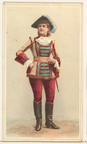 Editor: This is "Actress wearing military costume," a coloured-pencil drawing from 1891, part of a series issued by Duke Sons & Co. to promote tobacco. The subject matter is unexpected. What strikes you about this image? Curator: For me, it’s the material reality behind this ephemeral image that is compelling. These tobacco cards were essentially disposable. Yet, consider the labour involved: from the industrial production of the cards themselves to the selection and depiction of this actress, who is most likely performing labor on stage herself, entertaining largely male audiences of that period. Editor: So you're thinking about the actress’s own role as labor, and also, what kind of message the tobacco company was selling? Curator: Exactly! Look at the costume – it’s a theatrical representation, designed to sell an idea, an image. This print becomes a commodity, just like the tobacco it advertises. And consider the consumer: What sort of person might collect these cards? How might they engage with these images of women, essentially consuming both the product and the representation? It's fascinating to examine how mass-produced imagery perpetuates and disseminates ideas about gender and class. Editor: I hadn't thought of the act of collecting as a form of consumption itself. So the value isn't necessarily in the artistic merit, but the context of production, distribution, and… even disposal? Curator: Precisely. These cards give insight into the social fabric of the time, highlighting issues of consumption and gender. Editor: This makes me rethink what “art” is – it’s not just about aesthetics. Curator: Not at all; the means of production are as much of the artwork’s essence as the image. They highlight larger dynamics of industry and society. Editor: Thank you. I am going to see advertising in a very different way now.