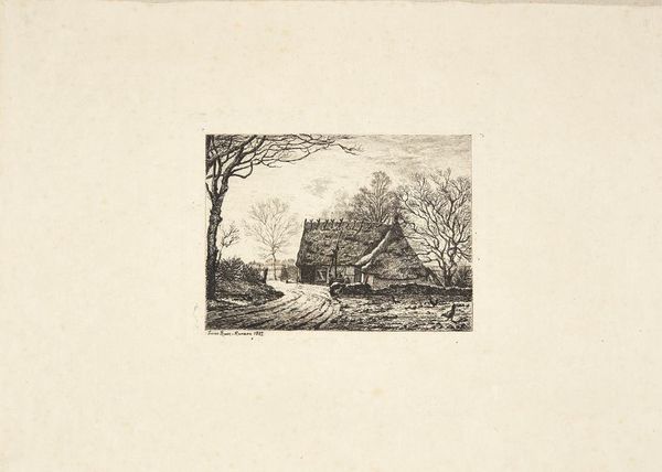 Gerhard Ludvig Lahde created this landscape with house and mill using etching, a printmaking technique, sometime between the late 18th and early 19th centuries. During this era, landscape art served not only as a picturesque scene but also as a reflection of cultural identity and societal values. This seemingly simple image of rural life invites us to consider the romanticized vision of the countryside during a period of significant social and economic change. The placement of the windmill and house within the landscape speaks to human presence and interaction with nature, but it does so through an idealized lens, obscuring the labor and class dynamics inherent in rural life. How does the artist's choice to depict this scene, absent of people, affect our understanding of the relationship between humanity and the environment? The quiet stillness evokes a sense of nostalgia, perhaps reflecting a longing for a simpler time amidst the backdrop of industrialization and urbanization. It reminds us to consider whose stories are told and whose are left out in the construction of national identity.