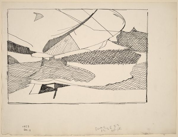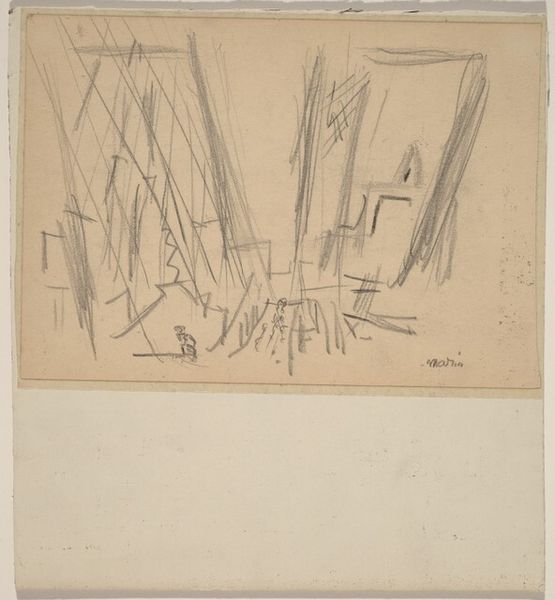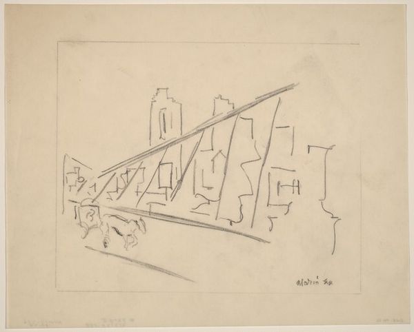 Editor: We’re looking at John Marin's pencil drawing "Woolworth Building" from around 1914. It’s a quick sketch, very geometric and kind of fragmented. How do you interpret this work? Curator: I see more than just lines depicting a building; I see a clash between the modern and the eternal. Notice that cross-like form near the top of the Woolworth Building—what feelings does that evoke for you? Editor: Well, at first, it just looked like a compositional element, part of the abstract design, but now that you point it out, it has religious connotations and an imposing sense of stability looming over this frenetic, angular structure. Curator: Precisely! It anchors the skyscraper. Marin is playing with visual symbols to show how this modern skyscraper aspires to something timeless, solid, perhaps even holy. What does the repetition of fragmented shapes convey? Editor: A sense of dynamism, maybe the energy of the city, but also maybe uncertainty. It's as if the building is vibrating. It is not the solid permanence of say ancient religious buildings. Curator: And that ambiguity, that tension between aspiration and instability, is crucial. Marin captures not just a building, but the anxieties and ambitions of a rapidly changing world. The symbol of the skyscraper has roots in power and hope, wouldn’t you agree? Editor: Absolutely! I never would have considered the potential for cultural memory and historical implications contained within this simple sketch before! Thank you! Curator: It's a reminder that even in the most modern forms, the echoes of the past reverberate, shaping our perception. We impose memories to create meaning.