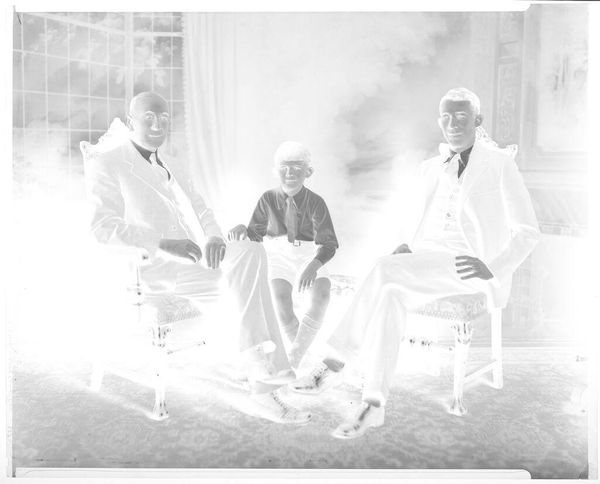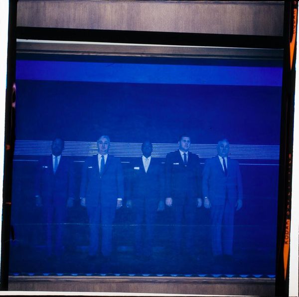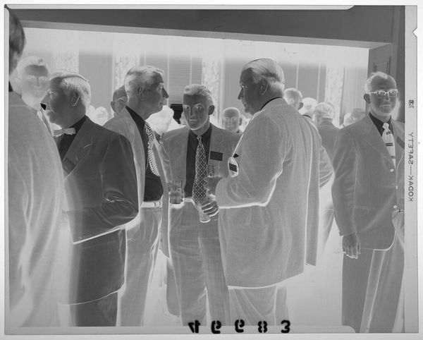 Curator: This photograph, "Untitled (five men standing in front of painting)" by Peter James Studio, presents a staged scene of men in suits. The print measures roughly 10 by 13 centimeters. Editor: The composition is quite striking, even in its inversion. There’s a definite weightiness in the tailored garments and the rather formal setting. It feels like a constructed performance. Curator: Indeed. The men's attire and arrangement speak volumes about societal expectations and the performance of masculinity within certain echelons. One might even interpret the materiality of their suits as signifiers of power. Editor: Precisely! And the choice of photography itself—the labor, the darkroom processes, the social ritual of posing—it all points to a specific, carefully constructed narrative. The material reality shapes meaning. Curator: I agree. Ultimately, the photograph's power lies in its ability to capture and freeze a moment laden with social cues. Editor: Absolutely. Thinking about the labor involved in creating this image gives it an entirely new depth.