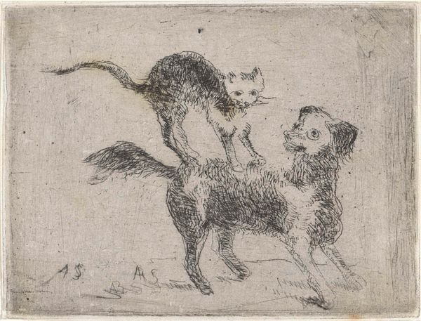 Lorenz Frølich created "Billede 9 fra En hunds liv" using drawing techniques to produce delicate lines that illustrate the scene. The composition focuses on a sleeping dog, around which birds interact, creating a stark contrast between stillness and activity. This contrast brings a poignant emotional depth. Frølich’s strategic use of line and space provokes reflections on themes of vulnerability and opportunism. The birds, drawn with meticulous detail, disrupt the dog's rest. This dynamic invites a semiotic reading, where the dog may signify innocence or naivety, and the birds may represent external forces exploiting this state. Notice how Frølich’s formal choices—the precise linework and balanced arrangement—challenge fixed meanings. This is not just a depiction of animals but an exploration into complex relational dynamics and challenges associated with existence.