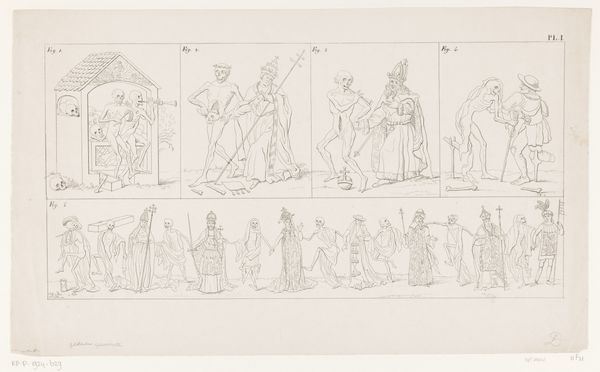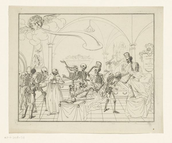 Leendert Springer created this drawing, "Pope and Cardinal Visited by Death," using pen in brown and gray ink. The composition presents two distinct scenes unified by a shallow, frieze-like space, divided by arches. On the left, the Pope and Cardinal are being carried in state while being mocked by the intrusion of death. To the right, death is actively beating an ecclesiastic with a bone. Springer masterfully uses line to create a sense of depth and movement, guiding the viewer's eye across the tableau. The subtle shading and intricate detailing of the figures contrast sharply with the minimalist background, drawing attention to the narrative's stark message. The drawing invites us to contemplate mortality and power. The division of the scenes, use of line and the contrast between the detailed figures and the unadorned background all function as signs that destabilize established values, reminding us of the transience of earthly authority. Springer prompts us to reflect on the enduring themes of human existence.
