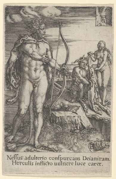Curator: Heinrich Aldegrever’s engraving, "Hercules Squeezing Antaeus to Death," from 1550, depicts a classic mythological scene. It's currently held at the Metropolitan Museum of Art. Editor: The violence jumps right out. The contorted bodies, the palpable struggle—it's all incredibly intense, especially given the miniature scale of the print. Curator: Absolutely. The engraving medium allows for incredibly fine detail. Look closely, and you'll see how Aldegrever uses line weight to convey the muscular tension in both figures. Hercules, the bringer of civilization, overcomes Antaeus, who draws his power from the earth—from materiality itself, you might say. Editor: And the lines are quite literally etched into the metal. The process is aggressive, carving away at the plate. It reflects this struggle in the image, a wrestling with materials echoing the literal wrestling depicted. Is there an alchemical aspect at play? Transforming Antaeus from the Earth bound into lifeless matter through pressure? Curator: It's very possible. Consider that Hercules is crushing Antaeus in the air, severing his connection to his mother, Gaia, the Earth. There’s a symbolic break, the triumph of human will—Hercules—over the raw, untamed power of the land, what that yields as a source of production, a kind of power. Editor: And this power dynamic is made tangible through the materials and processes of engraving: metal, acid, human labor. These raw components and techniques amplify and disseminate Aldegrever’s moralizing vision for Renaissance society. Curator: Indeed, this print isn't just about muscles; it speaks volumes about the relationship between humankind, nature, and divine authority within the visual culture of the 16th century. We see how myth acts as cultural architecture to contain our anxieties. Editor: So we’re really looking at a compression here—a physical crushing matched by the squeezing of myth into the limited space of this meticulously worked print, where medium and message are inextricably bound. Curator: Precisely, and this intimate scale allows us to reflect on timeless themes of struggle, power, and transformation—echoing across both human history and the cosmos. Editor: That intimate quality is thought provoking; the careful labor feels imbued with moral weight and artistic intent.