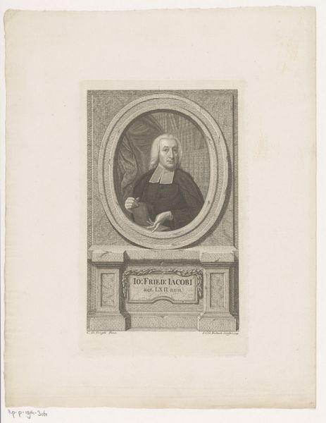 Curator: Looking at this engraving, what strikes you immediately? Editor: The detail! The layers and layers of fine lines to create texture...it almost looks like fabric, the way they’ve rendered the draping curtain at the top. Is that how the image has been produced, etched into a material that allowed this? Curator: Precisely! What we see here is Etienne Ficquet's 1775 engraving, a portrait of François de La Mothe Le Vayer. The Rijksmuseum houses it, among others in this collection. Editor: Le Vayer—judging by the trappings around his portrait, he must have been a man of letters. We see books, a globe…and is that a little oil lamp? How domestic, to place those in there! It adds such detail to his personality, it suggests to me he might have been the scholarly sort, of that time. Curator: Absolutely. These elements contribute to the overall symbolic narrative. The books signify knowledge and wisdom, the globe hints at intellectual curiosity and a broad understanding of the world. As for that lamp… it does evoke quiet contemplation. Remember also, the circle symbolizes eternity. Editor: The frame isn’t just a decorative element; it creates a container within which to house all those intellectual tools he has around him! He’s framed, caught between these intellectual objects, which are made objects nonetheless, that were crafted as cultural icons. All those little objects, like the book or lamp, must have also been traded and distributed. Do we know where those came from? Curator: Alas, pinpointing each artifact's origin isn't possible today, however, his portrait as a material artifact reflects and propagates certain ideals within the circles where Ficquet’s prints were consumed. What lasting images were constructed here? Editor: I’d argue it creates a narrative of enlightenment ideals – it’s both an intimate glimpse and a carefully constructed symbol that reveals the man’s image and cultural status. The method creates a visual and physical object; how do we weigh both? Curator: It is a worthwhile thing to pause over: an image so dense with symbols, crafted meticulously and replicated in its time for a certain audience to reflect on…I thank you for pulling my gaze back down to earth for that important distinction. Editor: And I appreciate how you've highlighted those historical elements to me. It's remarkable to consider its intricate method—a fascinating way to contemplate on one of the great men of the time, or at least his place within culture at the time of production!