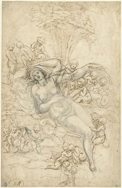 Curator: This graphite drawing is titled "Orpheus and Eurydice," created around 1761 by Jean-Honoré Fragonard. My immediate impression is that of swirling drama and the anguish inherent in the myth. Editor: Yes, Fragonard’s handling of the pencil itself speaks volumes. Note the almost frenzied application, particularly in the background hatching; this suggests speed and, perhaps, the urgency of Orpheus’s fateful backward glance. The quality of paper itself might reveal more about its original purpose; was it intended as a preparatory study? The cross-hatching of pencil might reveal a resist strategy if wash were added to complete the final work. Curator: Absolutely. The symbolism is intense here. Orpheus reaches back, desperate, yet the looming darkness surrounding Eurydice emphasizes her impending return to the underworld. It embodies the idea of forbidden love, a popular subject for Fragonard. There’s something eternally tragic in this precise moment of irrevocable loss, isn't there? It shows the universal psychological dread of death. Editor: Indeed. Beyond the personal drama, it reflects anxieties around mortality. I wonder what kind of pencils were available at this time and whether Fragonard chose this medium and support due to economic and resource constraints. Did the available drawing materials enable or restrain the artist’s practice in some way? Curator: Good questions. Thinking of materiality, the paper seems almost fragile given the subject's heavy emotion. But let's go back to Orpheus' lyre that you can make out in the drawing. It's nearly discarded on the ground, and how crucial is this instrument of harmony and order now rendered powerless by grief! It powerfully symbolizes the collapse of his world, the triumph of chaos and eternal suffering! Editor: Yes, the very instrument that enabled him to bargain with Hades is now, literally, cast aside. How fascinating! But also, the relative portability and transportability of the medium enabled art production within a changing and perhaps unsettled labor market, opening up new professional trajectories. Curator: I find that your perspective enriches the piece for me! Now I see, thinking about the materials allows one to better examine the artist’s immediate milieu, not merely his genius or intent. Editor: Exactly! Looking at the physical components is essential for us.