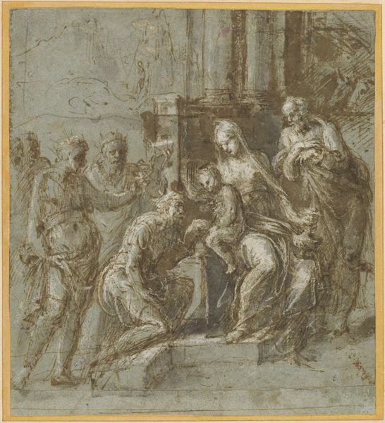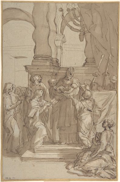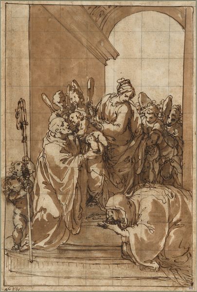 Pieter Crijnse Volmarijn created this drawing, "The Continence of Scipio", using pen and brown ink, with brown wash and touches of red chalk. The fluid lines and layered washes showcase a mastery of draughtsmanship. Volmarijn, active in the Dutch Golden Age, would have grounded his artistic practice in skillful technique, and familiarity with paper production, ink preparation, and brush handling. The choice of brown ink and wash gives the drawing a warm, tonal quality, while the red chalk adds subtle highlights, creating depth and dimension. The layering of the washes suggests a time-intensive method, a testament to the value placed on skilled labor in the art world of the 17th century. The drawing also sits within a longer history of skilled practices from manuscript production to printmaking, each with its own set of traditions and techniques. This piece, therefore, asks us to consider how the value of artistic skill intersects with broader social and economic structures, and the amount of work involved in the production process.