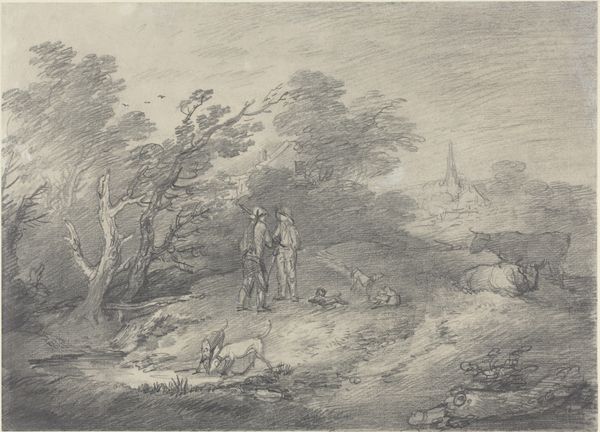 Editor: So, this is "Landscape with an Artist Sketching," created sometime between 1845 and 1910 by Mari ten Kate. It's currently at the Met, and appears to be primarily ink and pencil on paper. It feels almost like a snapshot of everyday life, but from a bygone era. What stands out to you about this piece? Curator: The layering of the drawing materials – pencil, ink, possibly even a wash – reveals much about the process. Think about the sourcing of those materials in the 19th century, the growth of manufacturing that allowed for standardized art supplies. Editor: That's interesting. I hadn’t considered the impact of readily available supplies. Curator: Consider also, the subject itself. The artist *is* sketching, documenting the landscape. There’s a self-awareness, a commentary on the very act of artistic production happening before us. What statement does it make by portraying the process itself? How is art and labor seen here? Editor: That makes me think about the other figures. They aren't doing any obvious work, seemingly observers. Are they consumers of this romanticised lifestyle that is only made possible by industry that they seem so removed from? Curator: Precisely! And the choice of landscape—an idyllic scene, yet created using mass-produced materials. The intersection highlights a growing disconnect between the source of those supplies, and their end usage. Can labor be easily discarded as part of the viewing pleasure when the tools are on full display? Editor: Wow, I never would have considered that on my own. I was just thinking about the nice scenery! Curator: It forces us to reconsider the romantic ideal. What's been left out of the drawing? Editor: I guess considering what is left out is as important as what is included. Thanks, I’ve certainly got a new perspective on it! Curator: The artwork provides a rich ground to understand changing perceptions of art, nature, industry, and labor in a quickly transforming period.