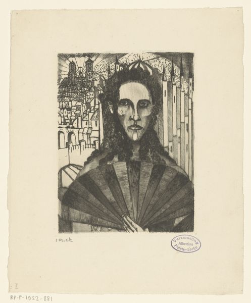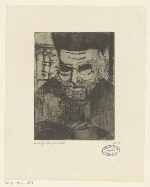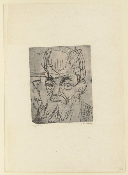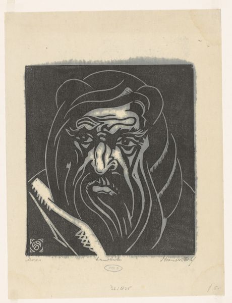 Editor: Here we have Lodewijk Schelfhout's "Head of Christ," made in 1915. It's a print, an engraving on paper. The heavy lines give it such a somber, weighty feel. What do you see in this piece that I might be missing? Curator: Well, it certainly hits you, doesn't it? It's a stark image, raw with emotion. What strikes me is how Schelfhout uses symbolism so effectively. The crown of thorns isn’t just a crown; it's become these almost aggressive radiating lines. Like pain emanating outward. It reminds me of that tension in art between spiritual longing and very physical suffering. Does that resonate with you at all? Editor: Absolutely! The radiating lines, I hadn't thought of them quite like that. They do amplify the sense of pain and almost... imprisonment? But I also sense a certain peacefulness in the closed eyes. Curator: Yes! Precisely! It's the paradox isn’t it? Even in the darkest of times, there's a search for inner peace. That contrast is part of what makes the image so powerful, so human. Do you get a sense of the artist’s intention here? Editor: I think so. A reflection on suffering and serenity existing together, perhaps? Curator: Indeed! And considering this was made during World War I, maybe it speaks to the collective pain and hope of that era. I am glad we lingered here for a while. Editor: Me too! I’m walking away seeing the piece with a different perspective. Thanks!