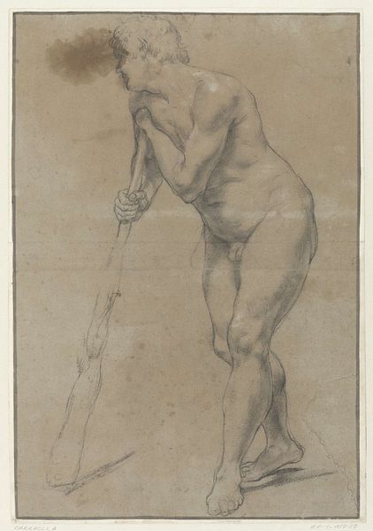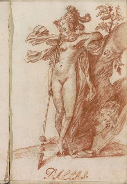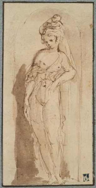 Curator: This drawing, made with pen in 1696, is titled "Op een fluit spelende faun," depicting a faun playing the flute. Hendrick van Beaumont is credited with this work. What’s your initial impression? Editor: Immediately, it strikes me as melancholic. There’s a vulnerability to the faun, emphasized by the nude figure and the slightly downcast gaze. It seems to hint at a loss of innocence or perhaps a lament for a bygone era. Curator: Interesting take. To me, the flute player calls on Pan and more broadly nature deities who evoke primal innocence. How do you understand the drawing style with its linear details? Editor: Knowing this is a Baroque piece, the almost performative theatricality makes me think about gender roles and the objectification of the body, even when mythologized. This depiction, idealized yet exposed, prompts questions about spectatorship and power dynamics. Curator: Yes, Baroque art did amplify drama and detail. But look at the choice of a faun as subject—in mythology they embody an unruly freedom and proximity to nature. The flute itself symbolizes not just music, but altered states, a connection to Dionysian abandon. Isn't the artist showing nature as a vital, unfettered space? Editor: I can appreciate that perspective. Yet I wonder, is that "unfettered space" really free when it is placed on display, penned and presented in this way? Even celebrating wildness, in Baroque terms, it can perpetuate control, framing and maybe even exploiting themes of the wild. Is it celebrating freedom, or carefully curating it? Curator: I suppose that is always the dilemma when containing something on the page. And thinking of it symbolically, the practice may be more about memory and dreams. This conversation has sparked a lot. Editor: Indeed. Thinking about how art becomes embedded with complex social meanings. And questioning easy narratives of freedom and celebration!
