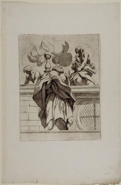 Editor: This is Sisto Badalocchio's "A Standing Prophet Gesturing with His Right Hand Raised, with Two Angels," created around the early 17th century. It's a striking etching, about 27 by 20 centimeters. What stands out to me is the dynamic tension between the prophet's active pose and the more static figures of the angels. What do you see in the composition? Curator: The composition, rendered through a network of fine lines, certainly establishes a visual hierarchy. Note the foreshortening and dramatic draping, conventions that elevate the prophet. The contrast between the active figure and the angels invites a deeper structural analysis. What elements create that dynamism? Editor: Perhaps the prophet's gesturing hand and the flowing robes contribute to the sense of movement? Curator: Precisely. The strategic use of line weight directs our gaze, creating a visual pathway. The entire arrangement—figures, drapery, and gesture—culminates in a compelling formal exercise. Editor: That is interesting. I hadn’t considered how the lines and forms lead the eye so deliberately. Curator: Indeed. By examining the intrinsic elements, we discover a structured discourse.