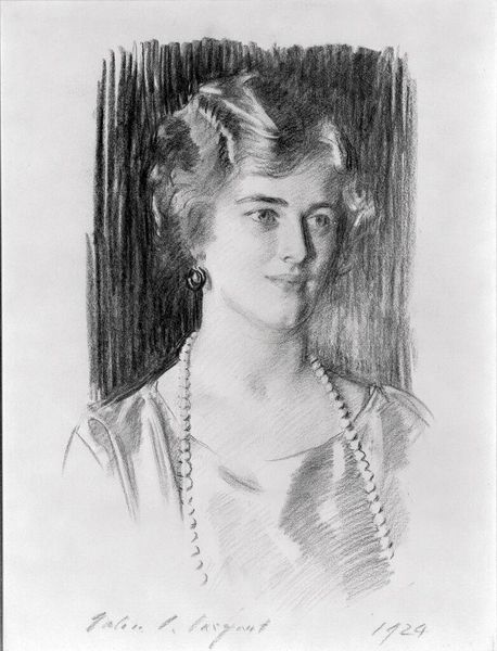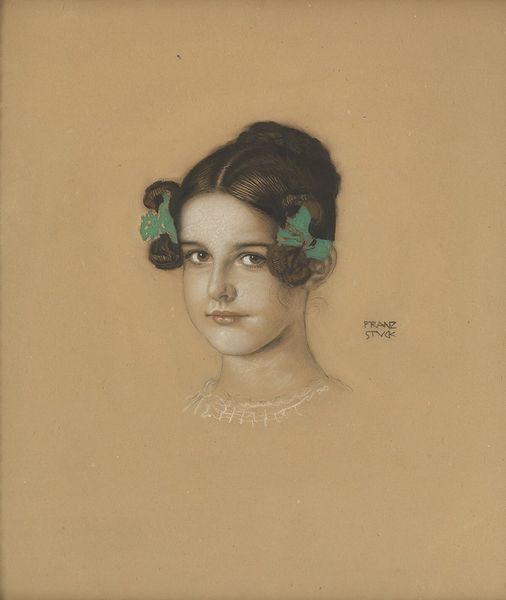 Curator: Before us is Boris Kustodiev's "Portrait of I.B. Kustodieva, daughter of the artist", created in 1919. Editor: There's an immediate serenity about it. It’s a gentle drawing, almost ethereal with the limited palette and delicate lines. The young woman’s gaze is direct, but there's also a certain pensiveness. Curator: Consider the historical context: 1919 Russia was a tumultuous time of revolution and civil war. A portrait of one's daughter suggests a need for intimacy, a wish to keep dear things safe from this broader societal upheaval. Perhaps even to emphasize domestic values threatened at the time. Editor: The choice of drawing as a medium, specifically, feels deliberate. It's immediate and personal, quite unlike the grand oil portraits typically commissioned by the wealthy at that time. Given the widespread poverty and shortage of supplies in post-revolutionary Russia, one might argue that a work like this, created out of readily available materials, is making a pointed statement about the value of human connection over material extravagance. Curator: And there is an undeniable tenderness visible in the depiction. Notice how Kustodiev used such subtle shading to convey her youthful complexion and her hairstyle typical of young girls. The material is pastel, and it is giving a sensitive quality to the rendering of the young lady. Editor: But the fact it is his daughter surely impacts its reading, and indeed its making. Was it intended for public view, or as an intimate portrayal for the family? Perhaps it serves as a powerful reminder that amidst monumental political changes, the importance of family endures. Its existence underscores a persistent element of humanity which often get overshadowed by public displays of power and ideologies. Curator: Indeed. Focusing on portraiture at a time where Constructivism or Suprematism reigned supreme can be seen as both a conscious distancing, but maybe, above all, as a preservation of fundamental values of pre-revolutionary society through personal portraiture. Editor: The creation of artwork always comes with historical, social, and individual dimensions. Seeing all the underlying values in portrait like this is rewarding and it does not overshadow a sensitive approach to its making in drawing.