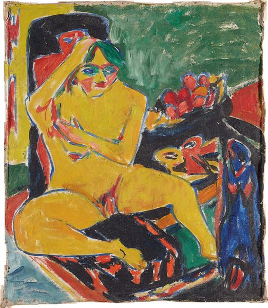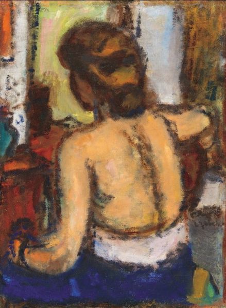 Editor: This is Bela Czobel’s "Girl with Red Gabushka" from 1955, an oil painting with a wonderfully textured, impasto feel. The subject's gaze feels very direct, almost challenging. What social narratives do you think this work engages with? Curator: Well, it’s interesting to consider this piece within the context of postwar expressionism and evolving ideas of femininity. The loose brushwork and intense gaze defy the more passive depictions of women in art history, don’t you think? Czobel, though working within the male-dominated Expressionist movement, perhaps subtly critiques societal expectations through this powerful portrayal. Do you perceive any intentional subversion here? Editor: It’s subtle, but I see what you mean. There's a vulnerability in her expression, but also a distinct sense of self-possession. It feels like Czobel acknowledges her position while simultaneously reclaiming it. Curator: Exactly. Her clothing, though suggestive, is rendered with a boldness that rejects objectification. Consider the social mores of the mid-20th century; how might this painting have challenged viewers' perceptions of female representation? Editor: I hadn't fully considered the social context. I was mainly focused on the formal elements. Now I’m thinking about how the gaze, the brushstrokes, and even the implied narrative, all push back against traditional, often male-dominated, portrayals. Curator: And isn't it amazing how much richer the work becomes when we look beyond the purely aesthetic, to explore its potential for feminist expression? Editor: Absolutely. Thinking about it in terms of identity and social context definitely adds another layer to the painting's meaning and impact. I appreciate you bringing this perspective!