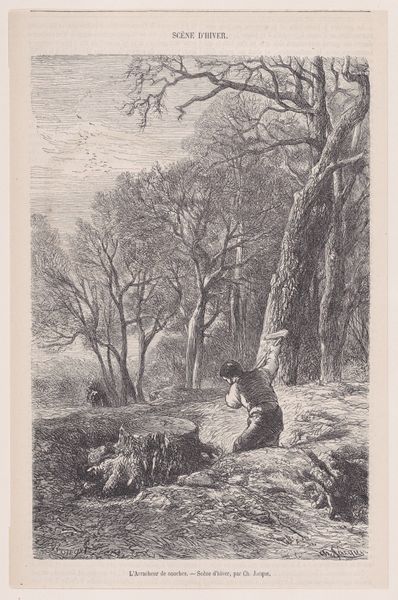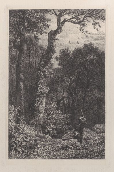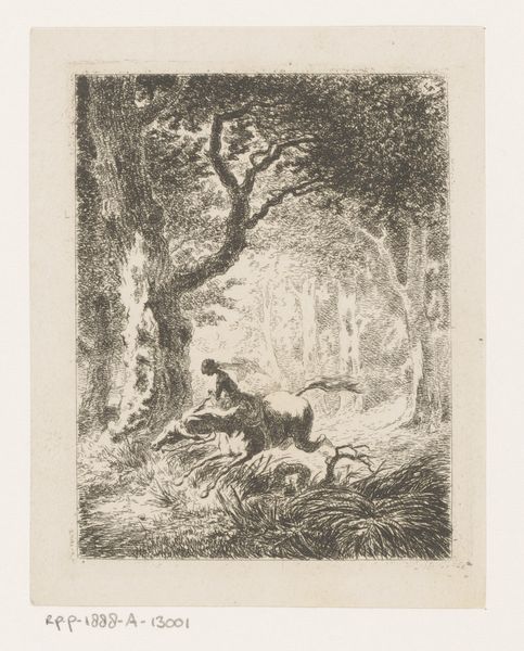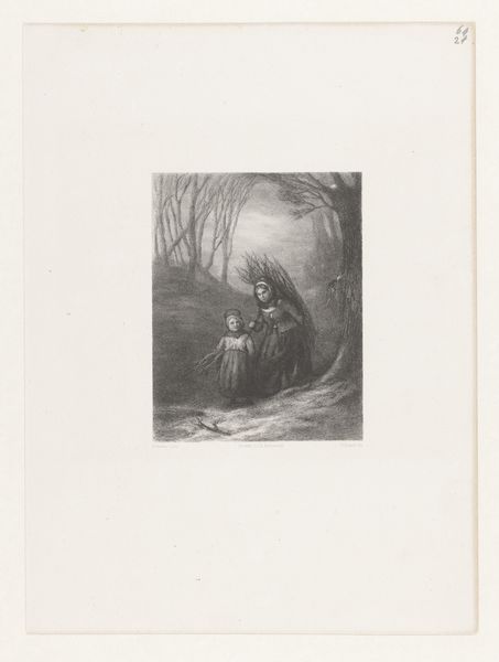 This print, *Twee vrouwen met takkenbossen in het bos*, was created by Karl Bodmer, using etching and depicts two women gathering wood in a forest. The somber monochrome palette and dense composition evoke a sense of quiet labor. The structure of the artwork contrasts the intricate detailing of the forest with the heavy burdens carried by the figures. Bodmer masterfully uses light and shadow to create depth, drawing our eyes into the forest. The repetition of vertical lines formed by the trees against the hunched postures of the women creates a visual rhythm that speaks to the cyclical nature of their work. Semiotically, the forest represents not only nature but also a space of work and survival. Notice how the artist plays with textures, from the roughness of the bark to the dense foliage, inviting us to consider the relationship between humans and their environment. This etching offers a discourse on labor and nature.