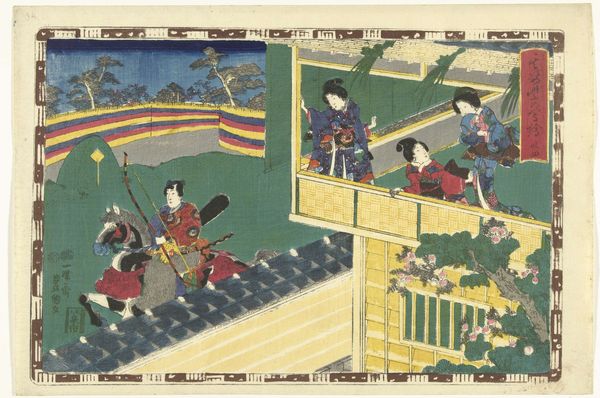 Curator: Immediately, I’m struck by the composition: how the orthogonal lines of the veranda draw the eye across the water. Editor: Indeed. Here we have a woodblock print created between 1851 and 1853 by Utagawa Kunisada, also known as Toyokuni III. It's entitled "Chapter 50". The piece offers an intricate glimpse into Japanese aesthetics of that period. Curator: Absolutely. And the way the artist uses colour – the restrained blues and greens contrasting with the more vibrant robes – is rather compelling, wouldn’t you agree? The planes intersect perfectly and give this feeling of tranquility. The arrangement reminds me of stage design for a minimalist theatrical work, creating a proscenium of light and shade. Editor: Contextually, the work provides a window into the social history of the Edo period, and is of ukiyo-e style, part of the aesthetic movement reflecting urban lifestyles and pleasure-seeking. This setting, likely a teahouse, becomes a stage for social interaction. These prints were vital cultural texts available to a broad audience, thus offering access to a slice of bourgeois life and the elite. Curator: The layering contributes so much: the eye moves fluidly around the interior through architecture that mimics traditional stage sets. There is a clever ambiguity with those irises appearing both reflections and the “real” thing—challenging our sense of space. The artist deliberately creates depth from this pictorial tension. Editor: Indeed. These "floating world" prints became powerful tools for social representation, simultaneously capturing and constructing public image. In a time of rapid social change and burgeoning cultural awareness, artists like Kunisada served as both observers and arbiters of contemporary style. Curator: And ultimately it is an accessible image, that gives us an insight to Japan and a traditional practice that has spanned centuries. Editor: Yes, one leaves this print thinking about the intersection between private experience and public life, all conveyed with extraordinary attention to composition and graphic clarity.
