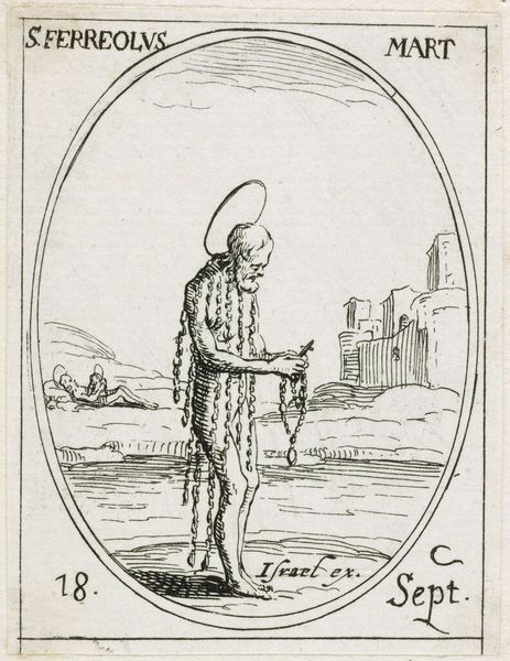 Curator: This is Jacques Callot's "Saint Philogonis," an engraving, part of a series of saints, rendered with fine lines, now residing in the Harvard Art Museums. Editor: It's a small world, isn't it? Immediately, there’s something spectral about the figure, like a ghost caught in the crosshatch of memory. Curator: The composition follows a strict visual order, typical of Callot's structured approach. Note the careful balance of the figure against the architectural backdrop and the table. Editor: But the light! See how the thin lines suggest not just form but also this ethereal glow? It gives Philogonis a sense of weightlessness, as if he's barely tethered to this earthly plane. Curator: Indeed. The use of line, particularly in the saint's garments, creates a dynamic rhythm, a play of light and shadow that animates the image. Editor: For me, it evokes the solitude of sainthood, the starkness of devotion etched onto a tiny copper plate. Curator: A fitting encapsulation. Callot masterfully distills the essence of sainthood through rigorous technique and thoughtful design. Editor: Precisely—a ghostly reminder, elegantly framed, that even the smallest image can hold immense spiritual weight.