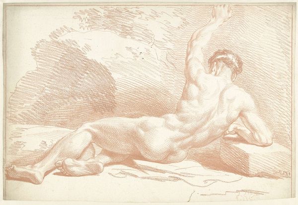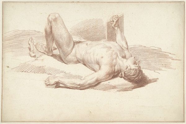 Curator: It has a melancholic quality, doesn’t it? A feeling of profound weariness…or is it perhaps surrender? Editor: This pencil drawing, titled "Mannelijk naakt, liggend op de rug, naar rechts"—"Male nude, lying on his back, facing right" – comes to us from the hand of Louis Fabritius Dubourg around 1725, and resides today in the collection of the Rijksmuseum. I wonder about its place in the context of the Baroque period. Curator: I do too, actually. There's something…raw about it, isn't there? That relaxed, vulnerable pose. You feel his weight, almost. He’s so earthbound, lacking all that drama we often see in the Baroque. Editor: I'd argue this groundedness speaks to Baroque realism – an attempt to capture genuine human emotion within these idealized forms. Think about the role of male nudes in art history, often tied to power, dominance… What does it mean when we see that reversed, subverted even? The face is partly obscured, and turned away from the light. Curator: Yes, and those hands are behind his head… There’s almost a playful ease about the way he is stretching, right? But there's something almost unsettling about his complete openness. This is definitely not your typical glorification of the male form, this feels intimate in its ordinariness. Editor: Agreed. It's precisely this ordinariness, or this lack of grandiosity that allows us to think about vulnerability in masculine terms. He's taking up space in an unguarded way, defying the need to perform strength, while simultaneously displaying such raw physicality. How radical is that? Curator: I think this work asks us to really confront the expectations of how men are "supposed" to present themselves, in art, and even more, in life. A kind of silent challenge to performative masculinity, centuries before the phrase even existed. Editor: Indeed. I think considering works like Dubourg's nude is a step toward a richer understanding of the male gaze and challenges inherent within the creation and observation of art. Curator: I leave this experience wanting to sink into that field and join this man on his languid journey... perhaps. Editor: And I see a figure of history being transformed before our eyes, his vulnerability demanding space.