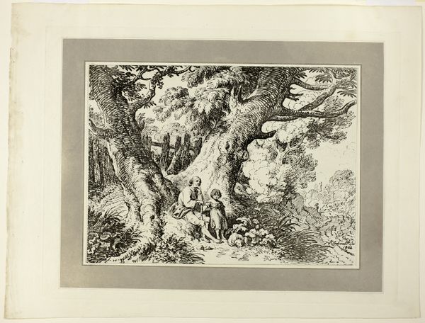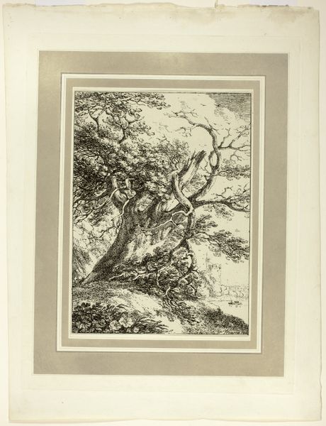Curator: Oh, this Richard Cooper the Younger piece is a marvel! It's titled "Landscape with Large Trees," likely dating from 1802 or 1803. What draws me in, initially, is the swirling intricacy of the lithograph and etching – the line work has a beautiful, almost manic energy to it, don't you think? It’s housed right here at The Art Institute of Chicago. Editor: My goodness, what a thicket of feeling. Dense. I am immediately struck by its melancholic intensity. There’s something so Romantic in the scale of the trees – looming and almost menacing over any implied human presence. Is that a figure huddled near the base of that giant trunk to the left? It’s as if humanity is dwarfed by something primeval. Curator: Good eye! Yes, you do find a solitary figure there, barely visible – completely absorbed into the landscape. To me, it suggests less menace, and more a surrender to the overwhelming beauty and power of nature, very much in line with the Romantic movement. It really makes you want to be enveloped by something grand, doesn’t it? It’s beautiful and somewhat unnerving. Editor: That very surrender has a darker side, though, doesn't it? In Romanticism, the sublime often walks hand-in-hand with a sense of the uncanny. I can’t help but notice how the tangled branches seem almost claw-like, and the limited tonal range makes the whole scene feel closed in. What might the trees symbolize here? Perhaps hidden desires or repressed trauma emerging from the unconscious? Curator: Absolutely – a touch of gothic wildness creeping into the idyll. And those branches… They remind me of anxieties branching and crawling their way through one's consciousness, absolutely. Thinking of trees as symbols, I wonder if it’s a commentary on the period’s increasing urbanization… Editor: Intriguing! It is like the city shrinks back and we suddenly understand that, by losing one element, we are gaining another in response: perhaps a renewed reverence, or maybe an outright fear, for the raw, untamed force of nature itself? The lithographic medium, with its dense blacks, only heightens that sense of primeval, hidden power. Curator: Beautifully put! It really makes you contemplate our relationship with our own internal wildness. Thanks for prompting that insight. Editor: And thank you for grounding me in the history. A fertile tension, I'd say, where nature is concerned.