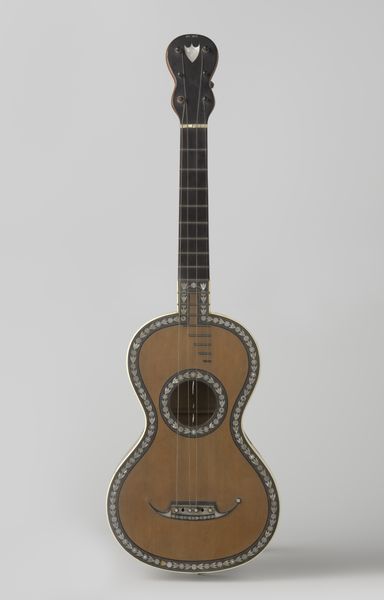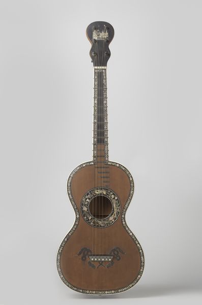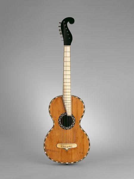 Editor: Here we have a guitar made by Pedro Fuentes, sometime between 1800 and 1858. It's made of wood, of course, and it's currently housed at the Met. The wood grain is stunning, almost hypnotic. What are your thoughts when you see it? Curator: Well, I think it's important to consider who had access to create and play such an instrument during that period. Was it intended for the wealthy elite, perhaps serenading gatherings with European melodies? Or could it have served other purposes within different social strata? Consider the contexts of labor; Who were the artisans that produced the elaborate carvings, and under what conditions? Editor: That's a great point. I hadn't thought about the socio-economic implications of the guitar itself, only about it as an aesthetic object. Curator: Exactly. Think about the music created and performed with this guitar, then consider that against the background of the 19th century – revolutions, colonialism, industrialization. Music wasn't simply entertainment. It was, and still is, often resistance, commentary, and cultural preservation. The very design could reflect regional styles or even symbolic statements. What kind of narratives might it express, both intended and unintended? Editor: So you're saying, by analyzing the materials, the craftsmanship, and the potential use of this guitar, we can glean insights into the lives and social dynamics of the time? Curator: Precisely. Art objects such as this are documents that echo throughout history and contemporary artmaking practices, carrying untold histories of resistance and creation. We need to think critically about these artifacts, recognizing their potential as tools for interrogating dominant narratives. Editor: That gives me so much more to consider when viewing this guitar. Thanks! Curator: Indeed. Always remember that objects such as this instrument can act as tangible connectors to a complex, layered past.