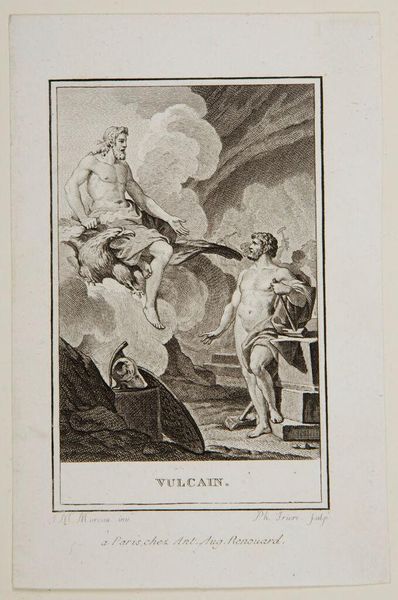 Curator: This engraving, "Jupiter and Io," is by Remi Henri Joseph Delvaux and is part of the Harvard Art Museums collection. Editor: It feels dramatic, almost theatrical, with the figures emerging from swirling clouds. The light and shadow create such a stark contrast. Curator: The story comes from Ovid's Metamorphoses. Jupiter, to hide his affair with Io from his wife Juno, transforms Io into a heifer, hence the rising into clouds. The visual language presents women in vulnerable positions. Editor: Interesting. I’m drawn to the composition itself—the diagonal lines of the clouds create movement, and the positioning of the figures guides your eye. Delvaux really understands the formal aspects of his craft. Curator: I agree, the artist certainly captures the drama inherent in the mythological narrative but such stories told visually are always from a patriarchal perspective. It's important to consider how such images reinforce social hierarchies. Editor: Indeed. It's a powerful piece, even if its themes are not exactly progressive by today’s standards. Curator: A strong example of mythological interpretations of the time and its complicated legacy, certainly.