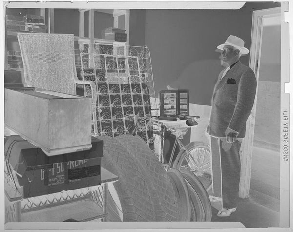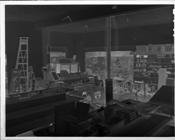 Editor: This photo by Hamblin Studio, "Untitled (Lee's Esso Grill, interior, pinball machine)", captures a seemingly ordinary scene. The pinball machine, though, feels like a portal, promising escape. What do you see in it? Curator: The pinball machine, yes, it's a powerful symbol. It represents not just entertainment, but also aspiration and chance. Consider its placement amidst tires and batteries – a juxtaposition of leisure and the necessities of the road, reflecting a culture on the move. What kind of continuity do you see between play and labour? Editor: I guess both require a certain kind of attention and persistence. It's interesting how the mundane and the fantastical collide in this image. Curator: Indeed. The everyday is always ripe with symbolic potential. We remember through these images.