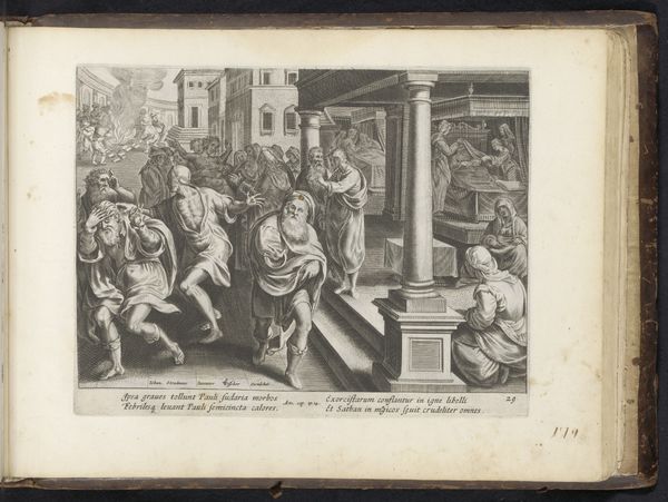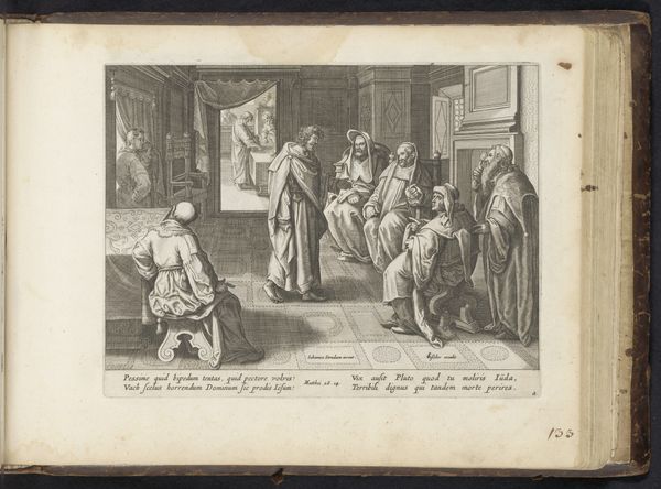 Curator: Here we have a print from 1582-1583 by Philips Galle, depicting "The Coronation of Cosimo De' Medici in 1569." It’s currently housed in the Rijksmuseum. Editor: My immediate impression is one of almost overwhelming detail. The artist has packed so many figures and architectural elements into a relatively small space; it feels incredibly dense. Curator: That density really reflects the atmosphere of the event itself – a carefully staged spectacle meant to project power and legitimacy. Cosimo's coronation as Grand Duke was a hugely symbolic event for the Medici family. Galle’s work presents the culmination of their ambitions for their status to become sanctioned by the church. Editor: The composition leads the eye right to the act of coronation, the Pope placing the crown. Yet, the flanking figures, their faces all meticulously rendered, demand our attention as well. Look at the variations of line quality – hatching to suggest shadows, the delicate lines defining the ornate clothing. The formality of this scene contrasts nicely with the details that showcase texture. Curator: It's fascinating how Galle, working within the Mannerist style and Renaissance traditions, is very careful to emphasize Medici power as something blessed, ordained. This piece is clearly meant to communicate to a broad audience the elevated status and divinely appointed legitimacy of the Medici rulers. Editor: I can see the political statement in the choice of subjects. However, I am more interested in how the architecture’s hard edges interplay with the curves of the figures to create dynamism in an otherwise stately and controlled event. Curator: Exactly! These historical prints were tools – meticulously crafted propaganda as well as important depictions of actual occasions. They would circulate through society shaping perceptions. It serves as a valuable source document, offering visual insights into the political and social contexts of the period. Editor: Agreed, and analyzing these deliberate choices that Galle is making, from line to composition, is key to unlocking meaning here, seeing the image as a construct rather than a window onto an objective moment in time. Curator: It's rewarding to consider this print as a layered piece, revealing the ambitions of a powerful family and how visual language shaped political narratives. Editor: Yes, and to consider the techniques deployed and how those shapes and structures contributed to constructing that power.