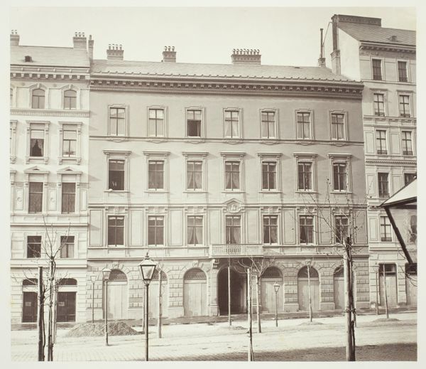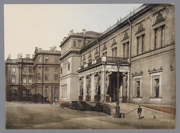 Curator: Look at this gelatin-silver print of the University of Bonn, taken in 1888. There's such an air of scholarly prestige conveyed in the photo, wouldn't you agree? Editor: It strikes me more as a picture of authority, honestly. Look at the way the building dominates the frame. I’m more drawn to thinking about who this institution historically served and who it excluded during this era. Curator: An excellent point. This type of architecture always carries layers of meaning. Notice the repetition of windows, each a little portal into learning but also creating this visual cadence almost suggesting a labyrinth of knowledge. Do you feel a sense of the rational, of ordered space? Editor: It speaks to the concept of ordered space but I would add, exclusionary space as well. We should keep in mind that while learning happened here, access to such learning was profoundly shaped by social structures, which at the time actively discriminated against women and members of minority communities. How did they perceive this building? Curator: The eye is immediately drawn to the statue positioned prominently above the central doorway. It could suggest patron deities and philosophical allegories meant to reinforce values of knowledge, contemplation. Does it invite questioning or rather promote adherence? Editor: Knowing the historical context, my feeling leans more toward promotion. In an image produced at the height of colonial powers, one must remember the role universities like this one had in codifying knowledge to support social hierarchies. What type of intellectual atmosphere would it have promoted during this period? Curator: Still, one might imagine, though, these architectural statements meant to evoke a sense of permanence and tradition, and maybe even a quest for understanding something that has continued since that photograph was taken. The quest of academic growth? Editor: Indeed. While physical structures stay immutable through time, its inhabitants continuously change and adapt, as with cultural awareness of this educational institute, through the past to present. Its importance must remain grounded and keep pushing towards intersectionality.
