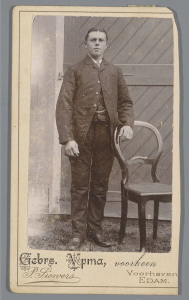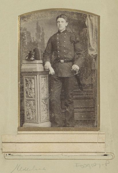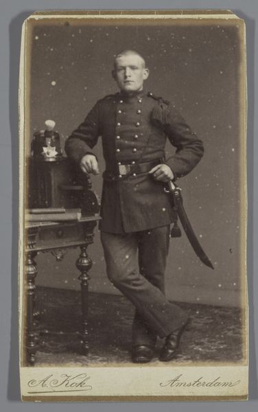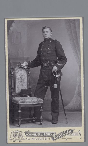 Editor: This is a photograph from between 1903 and 1920, entitled *Portret van een onbekende jongeman in uniform*, or *Portrait of an unknown young man in uniform*, taken by Jan van Roon. The sepia tones give it a certain gravity. What layers do you see beneath the surface? Curator: Indeed. The uniform itself is rich with cultural data. Think about its purpose – to signal belonging, authority, and often, sacrifice. What does the subject, this anonymous soldier, believe he represents through this garment? Does he see glory, duty, or simply a role he must fulfill? His rigid posture suggests a conformity to expectation, a visual submission to the collective. Editor: He does seem quite stiff, almost burdened. I wonder what "story" this portrait has in the present day? Curator: Look at the setting too – the plain backdrop, the posed stance. These were conscious choices. The photographer captured not just an individual, but also an ideal, a symbolic representation of military service. It's the early 20th century and what did serving the state and armed conflict look like at the time? Do we associate it more readily with heroism and hope? Editor: So the photo's power comes not just from what is visible, but also from what it communicates about values and collective memory? Curator: Precisely. The photograph captures a moment, but it also acts as a vessel, carrying with it a freight of cultural meaning that resonates through the years. Its impact derives from shared assumptions, aspirations, fears. The 'unknown' subject also allows people to project a variety of narratives to construct and maintain meaning over time. Editor: I didn't consider all those symbolic meanings embedded within it. It has given me new questions. Curator: It makes me ponder about visual traditions, cultural meanings, and continuities of state violence and their manifestations across generations.