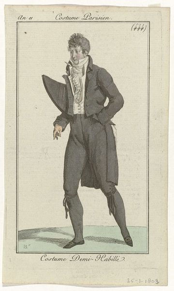 Curator: The commanding posture! The figure presented seems rooted, assured. How striking, wouldn't you agree? Editor: It's an image steeped in the visual language of power. The subject's bulk, his elevated stance, and the almost condescending gaze – it's all quite calculated, though tinged with the slightly comical. This is "Statesman No.093 - Caricature of The Duke of Rutland," a print by James Tissot, dated 1871. Curator: Caricature is key here. We see not merely a representation, but an active interpretation and social commentary embedded in the printmaking itself. Editor: The texture! Notice how the etching and watercolor work together, almost mimicking fabric in certain areas. See how Tissot has reduced him to these key features, a certain aloofness conveyed in the slumped shoulders and the puffed out belly. The subtle colouring directs our gaze, structuring how we view and process him as the 'Duke.' Curator: That very same colouring is interesting to dissect further. Consider how printed images like this served the purpose of social currency and visibility. We see how print media democratized the accessibility and circulation of portraits and images for the developing middle class and beyond. Editor: Fascinating. So, instead of dwelling purely on the formal distortion, you bring in the socio-economic dimensions tied to production and distribution of prints in 19th century society? Curator: Absolutely. We cannot understand such imagery unless we study the conditions and networks that allow an artist to transform a man into a ‘statesman’—then share that image broadly with public audiences, many of whom consume that very product for their daily consumption of social and political information. Editor: It challenges the traditional aura around portraiture. No longer just for private admiration. These visual statements now played into politics, public identity... Curator: Indeed. As for this particular subject, I cannot help but see the careful crafting and negotiation of public personas through material means. Tissot uses colour and tone here, a reminder of image circulation, power and status that speaks volumes even today.