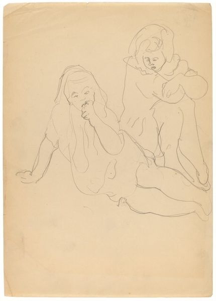 Editor: This lovely drawing, "Woman Embracing Two Children," by John Singer Sargent, gives such a feeling of tenderness. It looks like a preliminary sketch. What do you see in this piece? Curator: Well, it certainly captures a fleeting moment, doesn't it? Sargent's use of line is so expressive, almost like he's trying to capture the essence of maternal love in a single breath. Perhaps he was thinking of Renaissance Madonnas, but wanted something much more intimate, less posed. What do you make of that? Editor: I like that. I can imagine that the sketch is based on a Renaissance Madonna. It makes me appreciate Sargent's style even more. Curator: Absolutely! It's as if he's whispering a secret about art history itself. Something really beautiful is revealed.