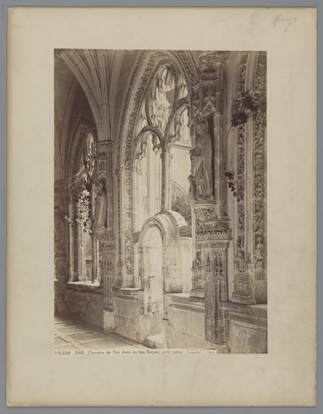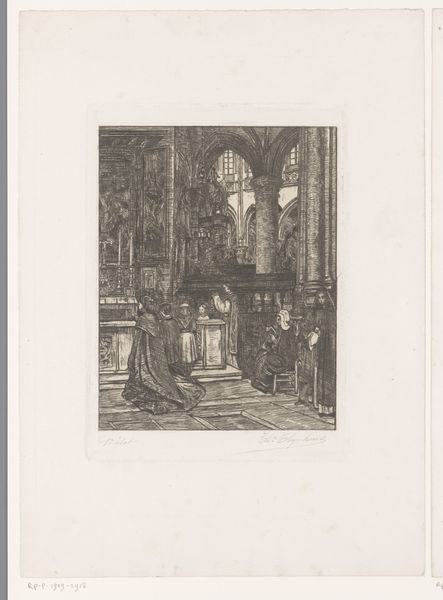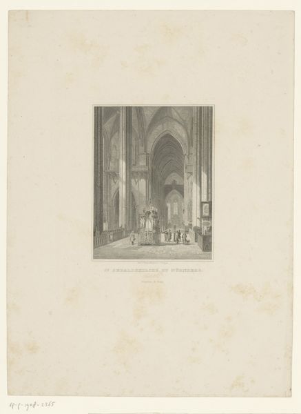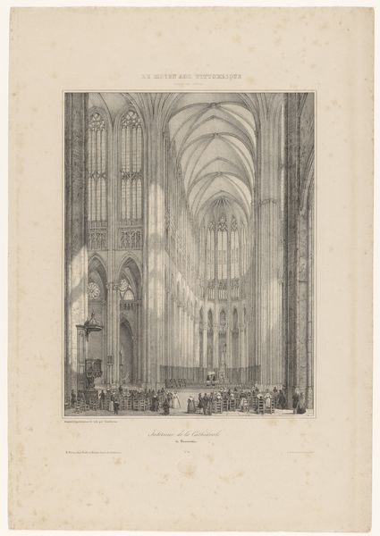 Editor: Here we have Emile Herson’s "Interieur van de Saint-Maclou te Rouen" from 1838, created as an etching and engraving. The grayscale palette evokes a serene and contemplative mood. What compositional elements stand out to you? Curator: The intricate linear work is striking. Observe how the architectural details are rendered with a fine precision, directing the eye upwards, emphasizing the church's height. The gradations of tone, achieved through delicate etching, create spatial depth, while the human figures, though small, anchor the grandeur of the architecture. Consider the semiotic weight of this stark contrast. Editor: The interplay of light and shadow definitely emphasizes the volume of the space, but I'm also drawn to the repetition of the archways. Does that have structural meaning? Curator: Precisely. The recurring arches not only establish rhythm and harmony within the composition but also symbolize the theological emphasis on ascension and divine order. Furthermore, the texture achieved by the etching creates a compelling materiality, reminding us of the physical construction of the church itself. Does that material reality invite consideration of the intended audience and market? Editor: I see what you mean about the materiality. The medium, being a print, also democratizes the image. Is the landscape designation due to depicting interior, versus external landscape? Curator: The application of "landscape" may reference treatment of space. Although we can consider this piece as a study in the internal structure, form and representation within this cathedral through the elements of line, form and tone. It shows his masterful skill of rendering textures via line. What have you gained from this brief analysis? Editor: Thinking about the form and texture and less about the scene makes a huge difference in appreciation. Curator: I agree, thinking this way allows a deeper level of structural insight to be gained when analysing Herson's etching.