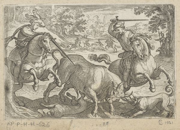 Curator: Here we have "Renard Goes with the Badger to Court to Appease the Lion's Anger" created sometime between 1650 and 1675. The artist is Allart van Everdingen and it's an etching, engraving and print of some kind, now residing at the Metropolitan Museum. What catches your eye initially? Editor: Well, immediately, I sense a kind of agitated energy. There’s a dynamic flurry in what's presented, which seems more dramatic than appeasing. Curator: It’s one of several works Everdingen made illustrating the medieval tale of Renard the Fox. This particular scene depicts Renard, the fox, in the company of a badger, journeying to court to placate the Lion’s anger. Editor: The horses, seemingly caught mid-gallop or mid-buck, really underscore the tension you mentioned, don't they? Are they symbolic, or more literal? Curator: Ah, now that's a fascinating question. While the horses aren't directly characters from the Renard tale, animals in these kinds of narratives often embody human traits or social classes. Given the story revolves around courtly intrigue, these horses perhaps represent nobility caught up in Renard's machinations. The animals themselves can each function as signifiers of different aspects of character— the clever fox, the honest badger, the powerful lion. Editor: Yes! The fox is an old archetype with layers of associations. Here, he isn't simply tricking the powerful lion, it looks like something has already happened between them, that this is a journey to make amends of some kind. Curator: Precisely. And Everdingen’s use of etching and engraving to create the image—those fine, sharp lines—adds to the impression of intricate plots and hidden meanings. Every detail feels deliberate, like a piece of a larger, more complex puzzle. It allows an intimate glimpse into both social commentary, the timeless play of power dynamics that's always happening in these narratives. Editor: Looking closer, it strikes me how modern it feels. The idea of animals acting as surrogates for human foibles…it's echoed even today in animation and storytelling. Thank you for unfolding the narrative threads and hidden symbolism, it really enhances my understanding.
