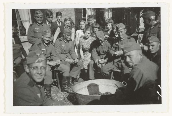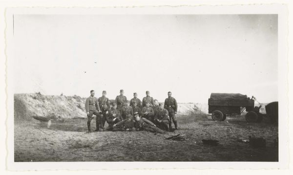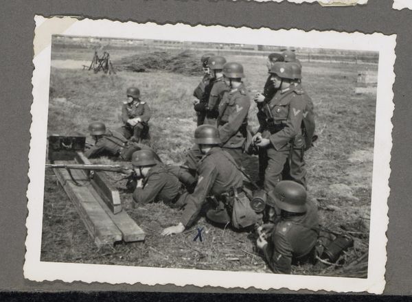 This small, anonymous photograph captures soldiers during a shooting exercise in Vlaardingen. What strikes me is the stark contrast and how the tones create a sense of depth. It's a study in greys, from the near-white sky to the deep shadows in the foreground. The surface is smooth, as is typical with photography, but the composition gives it a gritty feel. Look at the soldier in the foreground, lying prone, his rifle extended – the way the light catches his helmet and the barrel of his gun tells a story of precision and intention. Yet, there's also a sense of the mundane, a routine being carried out. It reminds me of some of Gerhard Richter’s photo paintings; the way he used black and white photographs as a starting point. Both Richter and this anonymous photographer manage to find a strange beauty in the everyday, even in scenes loaded with tension. Art, like life, is full of these contradictions, isn't it?