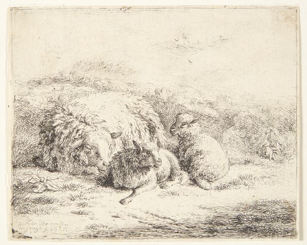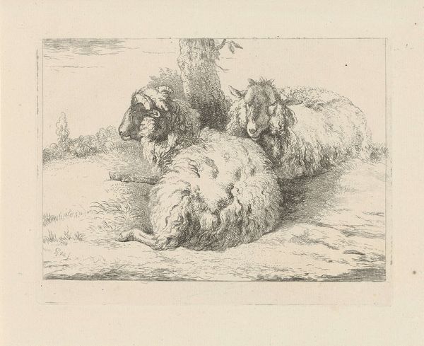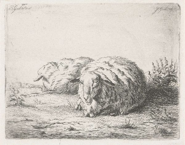 Jacobus Cornelis Gaal created this etching of two sheep, rendered in a limited palette of blacks, whites and greys. The foreground is dominated by two resting sheep, their woolly forms filling the space with a comforting density. The composition is structured by contrasts: the soft, rounded shapes of the sheep against the sharper, linear details of the landscape. Gaal’s use of hatching and cross-hatching creates texture that defines the sheep's fleece, giving them a tangible presence. The contrast between light and shadow helps to model the forms, bringing a sense of depth to the compact composition. The etching technique lends itself well to this pastoral subject. The lines of the etching create a visual language that invites us to consider the simple, bucolic beauty of rural life. The interplay of light and shadow, form and texture, transforms a humble scene into a study of serene contemplation. The artwork reminds us that meaning is often found in the simplest of forms and the most ordinary of subjects.