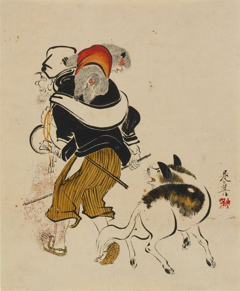 Curator: What a charmer! I'm immediately struck by this figure—sort of a menacing, but undeniably quirky, energy. It's got that dark humor I really dig. Editor: Indeed. Here we have Kitagawa Hidemaro’s 19th-century woodblock print, “Shōki Carrying Two Baskets of Demons.” You'll find it in the collection of the Minneapolis Institute of Art. What captivates me is its intersection of folklore, power dynamics, and societal control expressed through ukiyo-e's visual language. Curator: Baskets of demons, huh? Well, that certainly sets the stage for some potent symbolism. I see a figure burdened, or perhaps empowered, by his cargo. It reminds me of that feeling of wrangling my own anxieties, you know? It's strangely relatable! Editor: Exactly! Shōki, the demon queller, becomes a fascinating lens to explore social anxieties and marginalized identities. Are the demons contained, or is Shōki merely a glorified enabler within a system that demonizes certain groups? The very act of "carrying" forces us to confront complicity and accountability. Curator: I'm taken by Hidemaro's style here. It's almost like a visual haiku—the fewest lines possible to convey maximum emotion. Each stroke of ink pulses with this raw, restless energy. Plus, Shōki’s scowl could curdle milk. Editor: Yes, it's not just about the literal capture of demons but about the performance of power. Consider how the artistic choices—the exaggerated features, the dynamic lines—construct Shōki’s image as both powerful and grotesque, reinforcing a specific narrative of dominance and perhaps, inherent instability of the wielder. Curator: Maybe the artist is poking fun at the whole idea of demon-slaying, suggesting it's all a bit ridiculous? The demons themselves are almost cuddly! Is it possible that we the viewer are being urged to reconsider who exactly the true demons are? Editor: A vital point. Through Shōki, Hidemaro perhaps critiques those who benefit from creating enemies and reinforces societal hierarchies, even under the guise of justice. This print challenges us to reflect critically on the forces that perpetuate social divisions. Curator: Looking at this again, I'm struck by the incredible simplicity and raw energy in this old print. I keep coming back to what these demons really represent in our modern era? Editor: And so, Hidemaro's "Shōki" resonates across centuries. Art isn't a mirror reflecting the world, but a hammer shaping it and prompting dialogue across time and space.